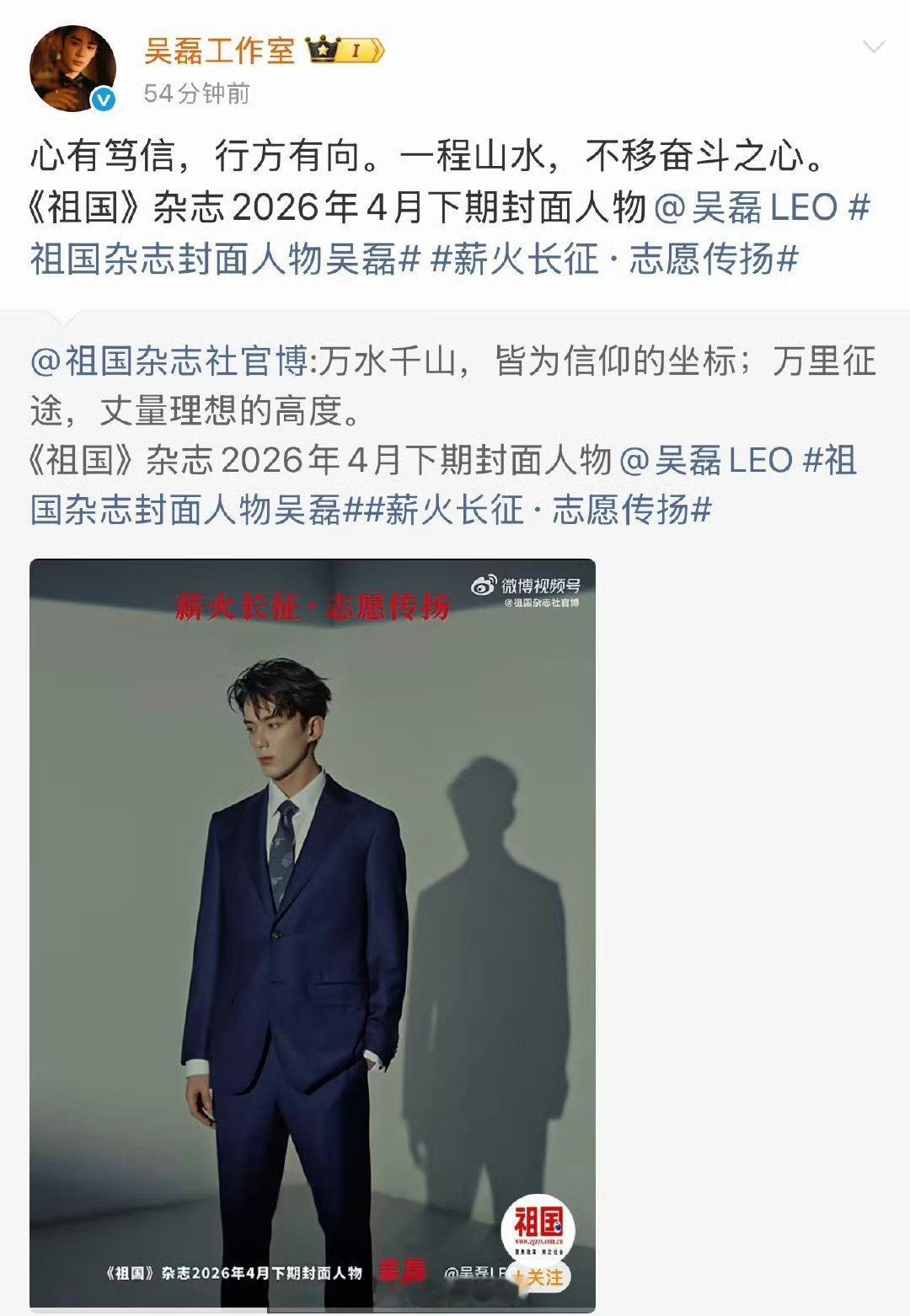 《祖国》杂志创刊以来,首次邀请文艺界人士担任封面人物,好正能量的吴磊啊,太厉害了!吴磊从不在舒适区打转,古偶星汉灿烂拿到代表作就闯现偶。在暴雪时分播的好之后就闯电影圈,今年电影作品估计会和大家陆续见面~但他没有停下脚步,现在又继续耕耘男频玄幻剧剑来…感觉他的人生没有瓶颈,一直在突破自己不断拔高上限