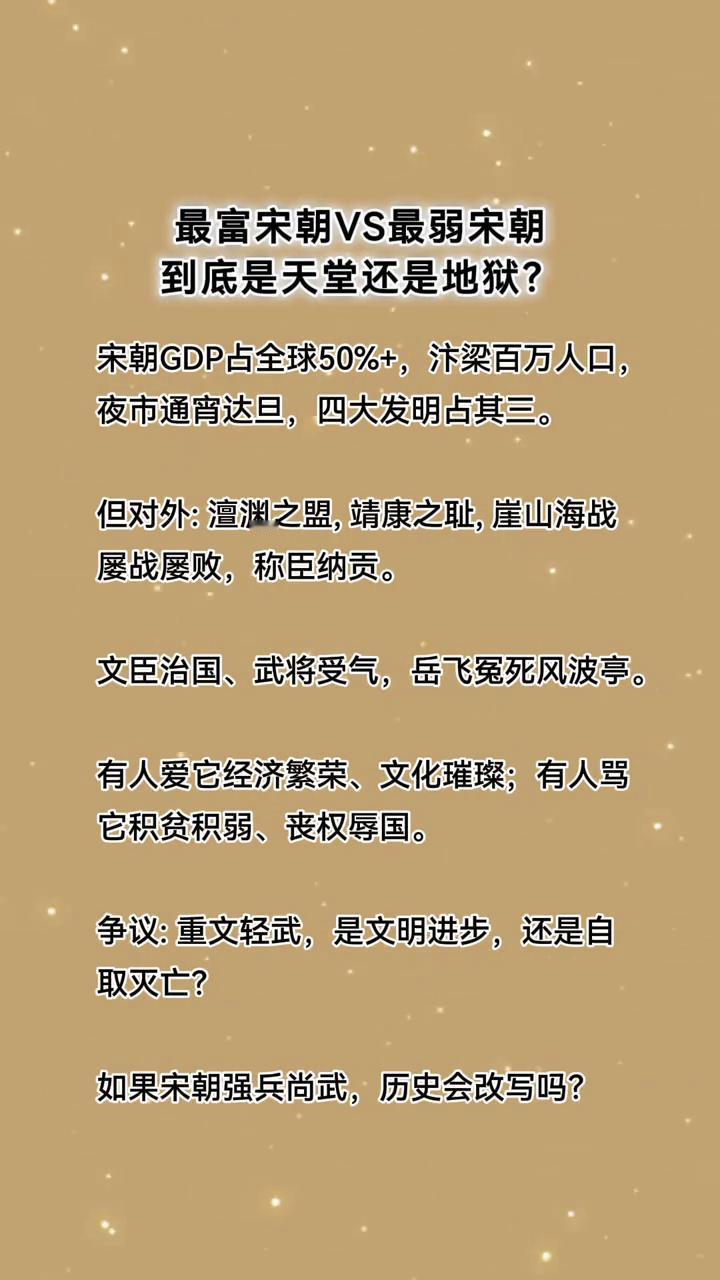 宋朝GDP占全球50%+,汴梁百万人口,夜市通宵达旦,四大发明占其三。但对外:澶渊之盟,靖康之耻,崖山海战屡战屡败,称臣纳贡。文臣治国、武将受气,岳飞冤死风波亭。有人爱它经济繁荣、文化璀璨;有人骂它积贫积弱、丧权辱国。争议:重文轻武,是文明进步,还是自取灭亡?如果宋朝强兵尚武,历史会改写吗?