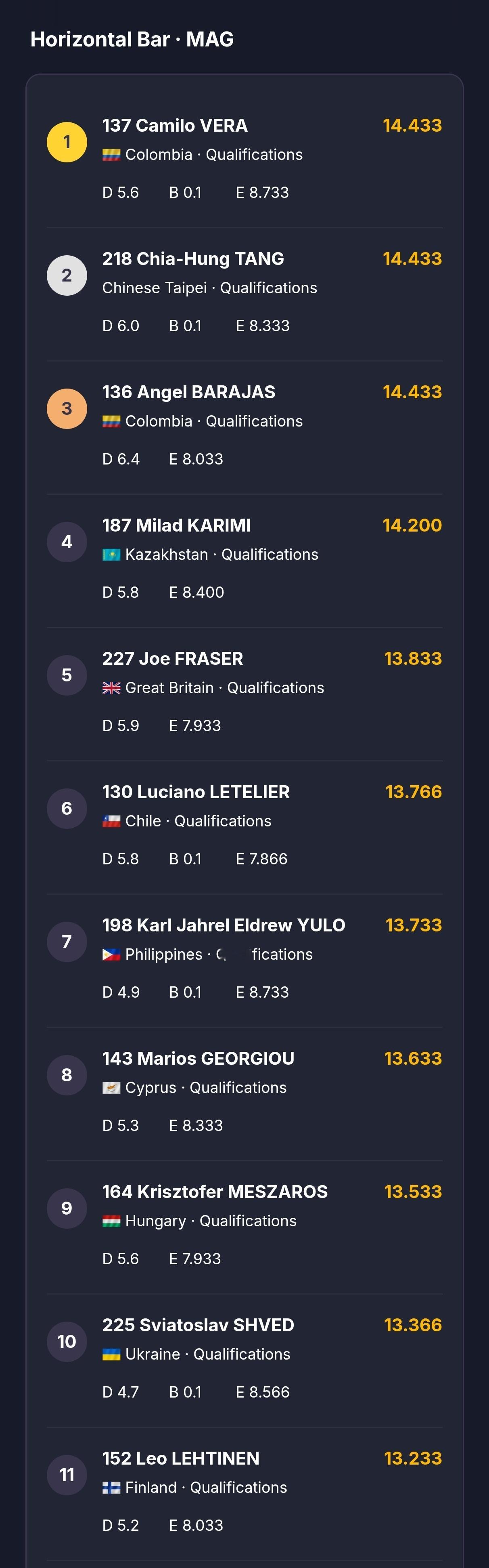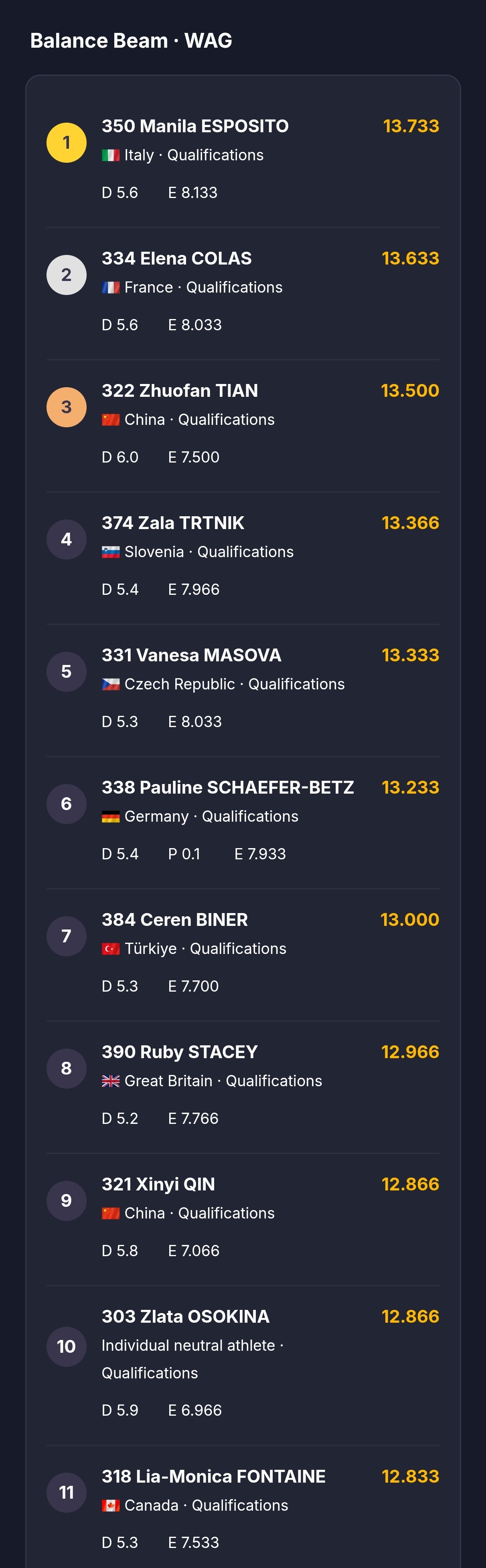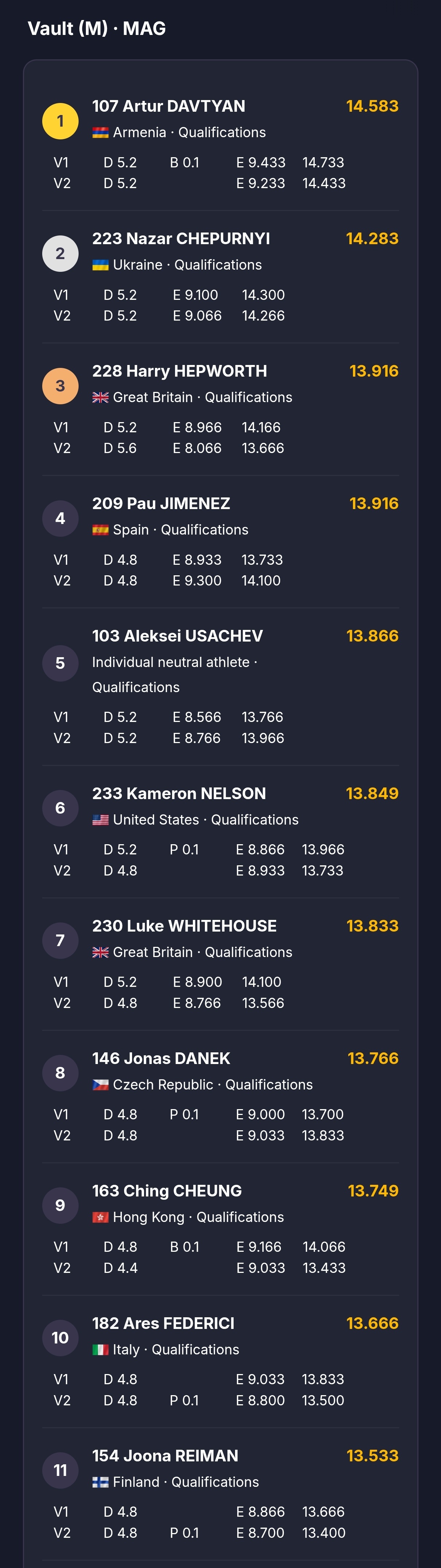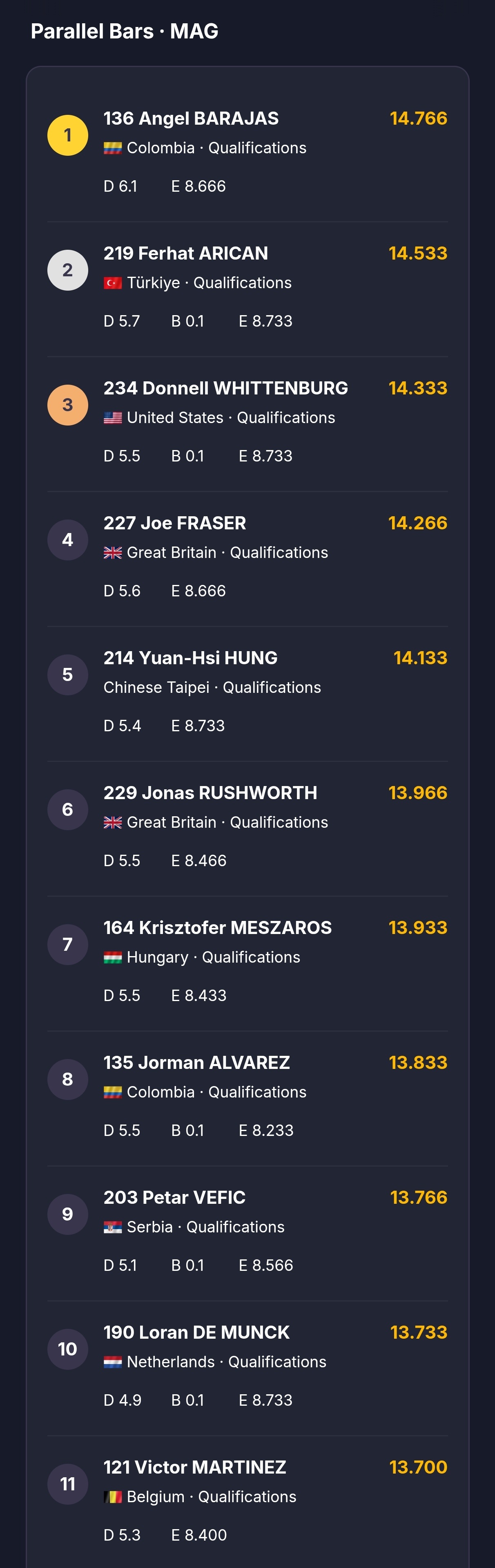 世界杯奥西耶克站资格赛Day2成绩单(前8+替补3)男子跳马、双杠、单杠,女子平