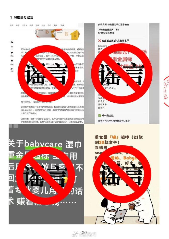【#Babycare否认湿巾含重金属锑#】4月11日,发布声明,否认Babycare湿巾产品含重金属锑的不实传言。