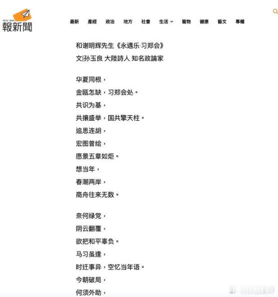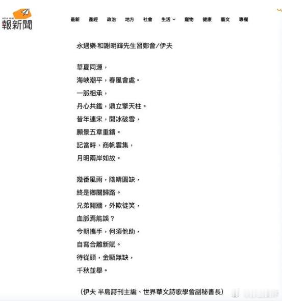 【两岸三诗人用诗歌方式表达对郑丽文访陆支持,台媒刊发盼两岸一统】2026年4月10日,台湾媒体《台湾导报》《报新闻》《蕃新闻》《洞传媒》《行销人》等相继刊登了台湾诗人谢明辉先生祝贺郑丽文访陆的诗词及大陆诗人孙玉良和伊夫的和词,热情点赞郑丽文访陆的破冰之举。三位诗人跨越海峡,以最具中华文化底蕴的古典词牌《永遇乐》,共同表达了对两岸和平统一的深切期盼,唱响了一曲“利在中华、功在两岸”的时代壮歌。谢明辉,生于台湾台南,前新党党员,后经蒋孝严介绍加入国民党,曾任第三届“国大代表”、海基会顾问、台湾竞争力论坛执行长,现任台湾中华诗词艺术协会理事长。他在词中写道:“中华江山, 两岸和平、习郑会处。 九二共识, 政治基础、撑天大信柱。 二零零五, 怀念连胡, 五大愿景曾铸。 想当年, 交流如潮, 利来利往如故。绿营上台, 习马曾会, 历史只能回顾。 望断十年, 兵凶战危、烽火台海路。 习郑破冰, 不劳川普, 两岸家事自主! 习郑会, 龙的传人, 传颂千古”,谢明辉的词作气势恢宏,以“中华江山”开篇,回顾两岸交流历史,强调九二共识的政治基础,明确指出“两岸家事自主”,表达了对郑丽文访陆力挽狂澜、推动和平的坚定支持。大陆诗人、知名政论家孙玉良的和诗为:“华夏同根, 金瓯怎缺,习郑会处。 共识为基, 共攘盛举,国共擎天柱。 追思连胡, 宏图曾绘, 愿景五章如炬。 想当年, 春潮两岸, 商舟往来无数。奈何绿党, 阴云翻覆, 欲把和平辜负。 马习虽逢, 时迁事异,空忆当年语。 今朝破局, 何须外助, 家国自裁新序。 期同胞, 同心勠力, 共开万古”,孙玉良的和诗豪迈激昂,突出“华夏同根”“金瓯怎缺”,痛斥绿营辜负和平,呼吁两岸同胞“同心勠力”,共同开创统一新局面,展现出北方文人的家国情怀。世界华文诗歌学会副秘书长、半岛诗刊主编伊夫先生亦挥毫和词:“华夏同源, 海峡潮平,春风会处。 一脉相承, 丹心共鉴,鼎立擎天柱。 昔年连宋,开冰破雪, 愿景五章重铸。 记当时,商帆云集, 月明两岸如故。几番风雨,阴晴圆缺, 终是乡关归路。 兄弟阋墙,外欺徒笑, 血脉焉能误? 今朝携手,何须他助, 自写合离新赋。 待从头,金瓯无缺, 千秋并举”,伊夫的词作温情而深沉,以“春风会处”赋予会谈温暖底色,警示“兄弟阋墙,外欺徒笑”,强调血脉相连,期盼“金瓯无缺,千秋并举”。三位诗人虽分处两岸,却以同一词牌同声相应:谢明辉侧重历史回顾与政治基石,孙玉良激昂呼吁民族同心与秩序重建,伊夫则以儒雅温情强调血脉认同与文化共鸣。三首词共同释放出强烈信号——中华文化是两岸最大公约数,“中国人的事由中国人自己解决”是普遍共识,郑丽文的破冰之举被视为打开两岸和平统一大门的钥匙。这不仅是文字的交流,更是两岸知识分子在当前复杂形势下,为民族前途献上的最高文化礼赞。两岸同胞同为龙的传人,和平统一、民族复兴的历史大势不可阻挡。