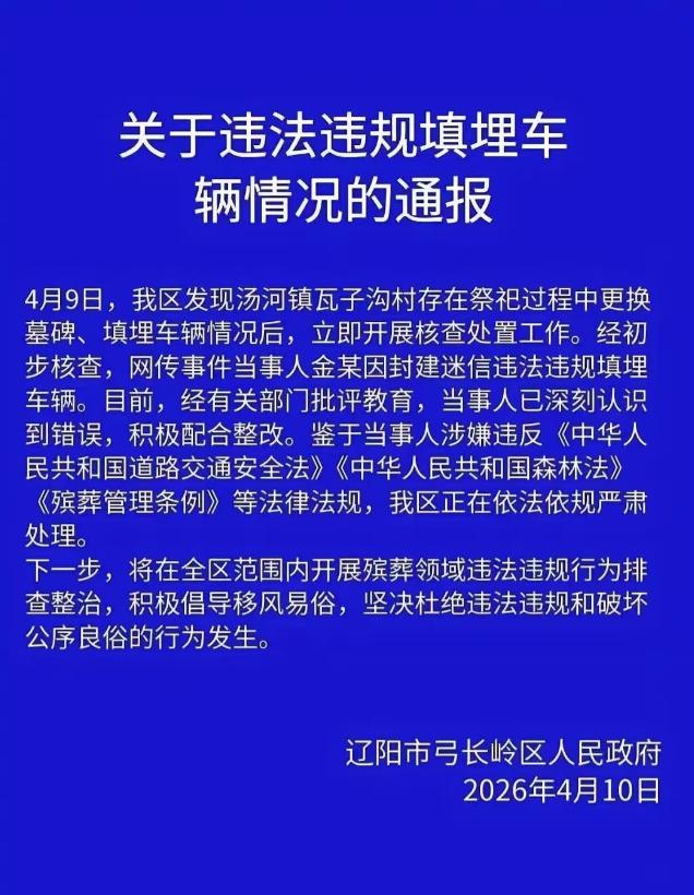 目前,涉事车辆已被挖出暂扣,金某认错致歉、配合整改,联合调查组正在依法严肃处理,当地将开展殡葬领域违法违规排查整治,相信能有效遏制歪风邪气,引导大家践行文明殡葬、传递正能量。