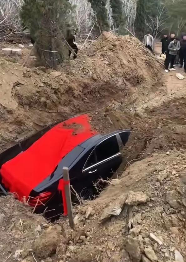 随着挖掘机缓缓下放,这辆看着崭新的奔驰被推进事先挖好的土坑,泥土一点点覆盖,没过多久,百万豪车就被彻底埋进地下。