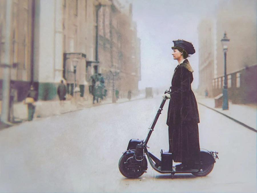 110年前的电动溜溜车?该照片摄于1916年的英国伦敦,一名妇人正骑乘该车悠闲逛