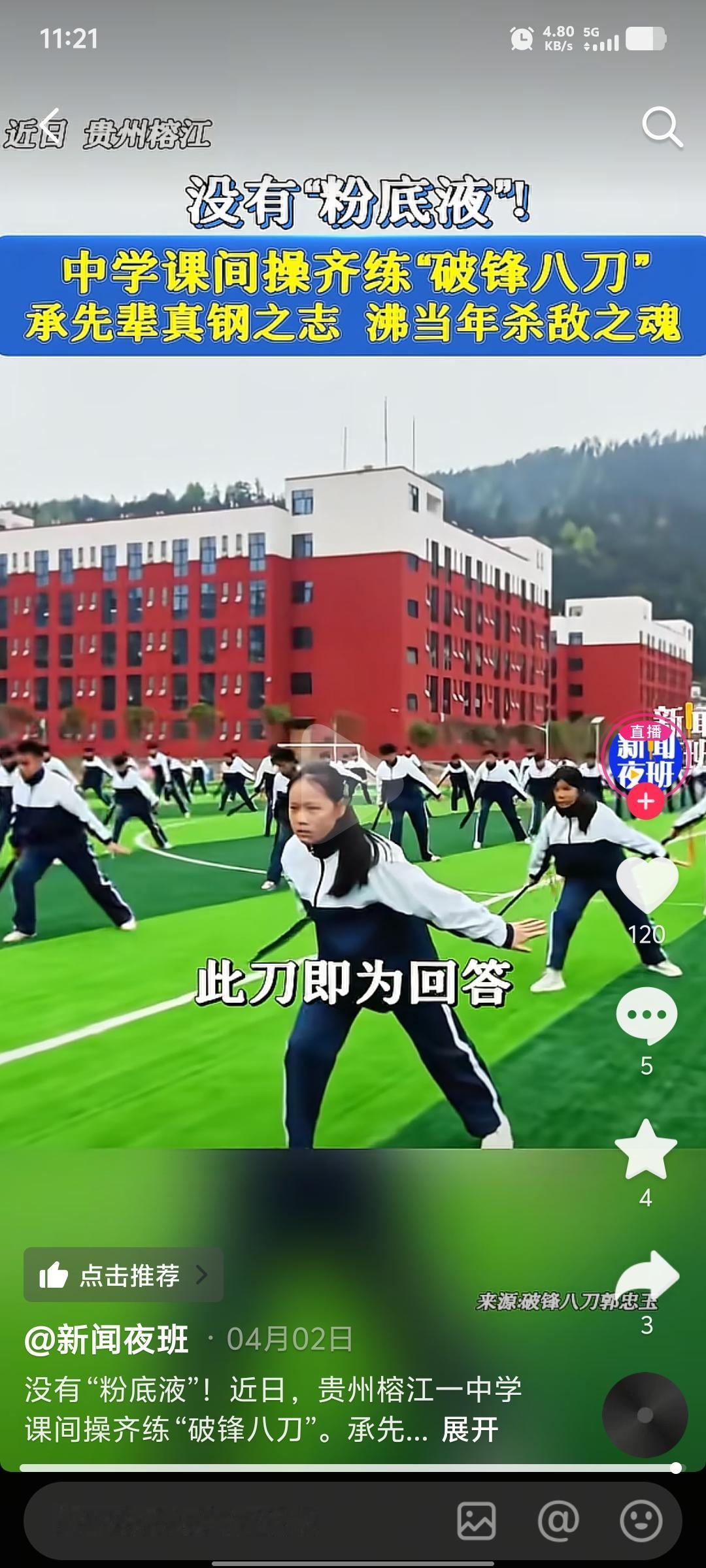 如今,榕江六中的少年们练的是刀,传承的是精神。他们手中的塑料训练刀,没有当年抗战大刀的锋利,却握着沉甸甸的责任。每一次劈砍,都是对先辈浴血奋战的致敬;每一次转身,都是对民族苦难的铭记;每一声呐喊,都是对“少年强则国强”最生动的践行。