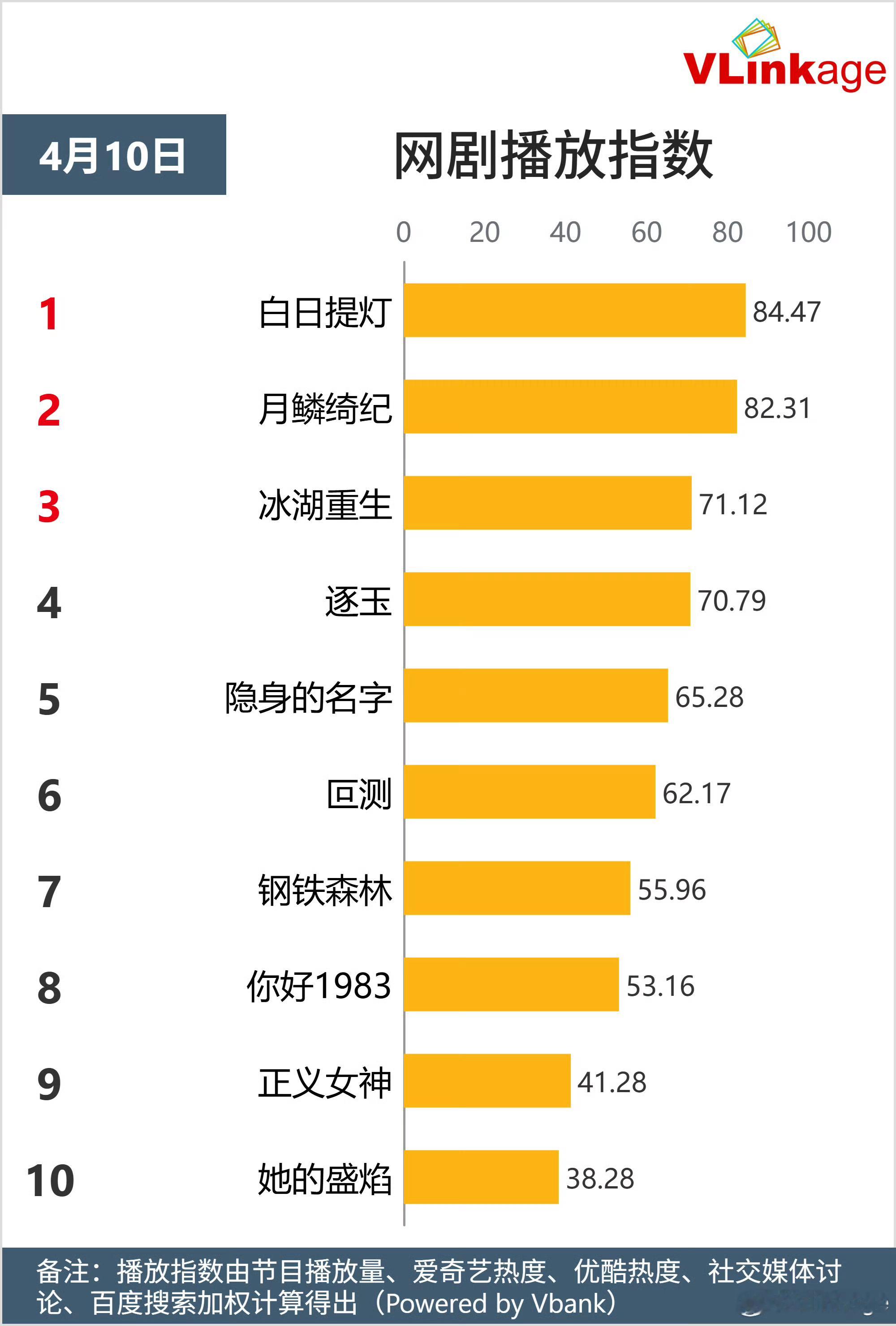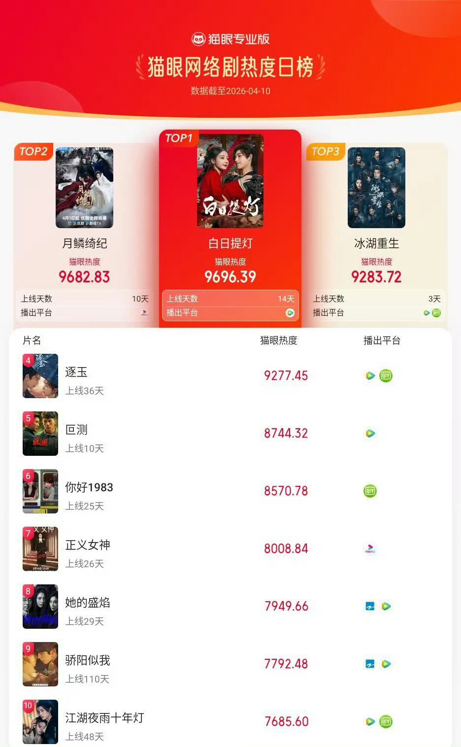 恭喜迪丽热巴《白日提灯》10日猫眼网络剧热度日榜登顶TOP1剧集v指数84.47