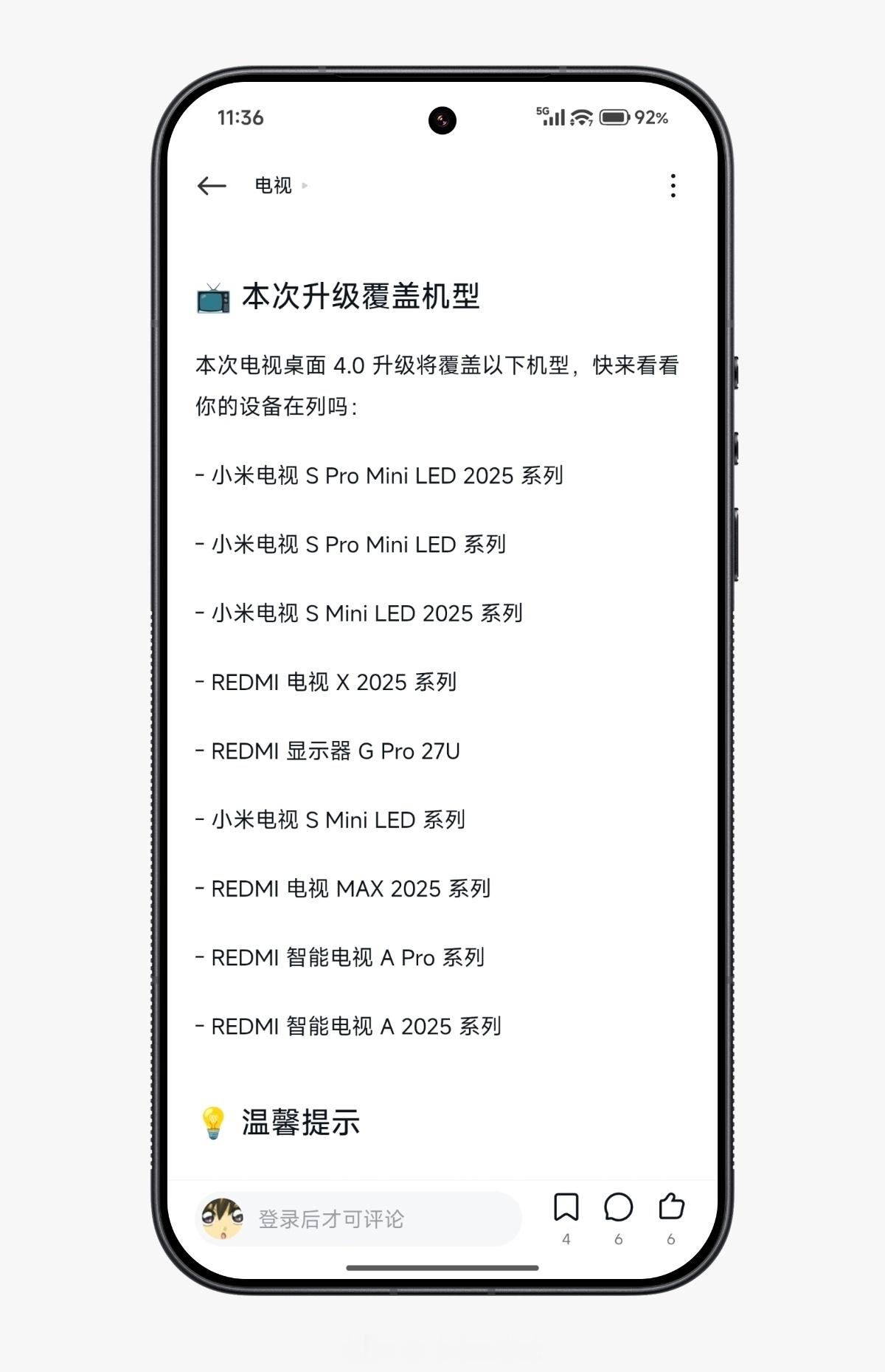 - 小米电视 S Pro Mini LED 2025 系列- 小米电视 S Pro Mini LED 系列- 小米电视 S Mini LED 2025 系列- REDMI 电视 X 2025 系列- REDMI 显示器 G Pro 27U- 小米电视 S Mini LED 系列- REDMI 电视 MAX 2025 系列- REDMI 智能电视 A Pro 系列- REDMI 智能电视 A 2025 系列