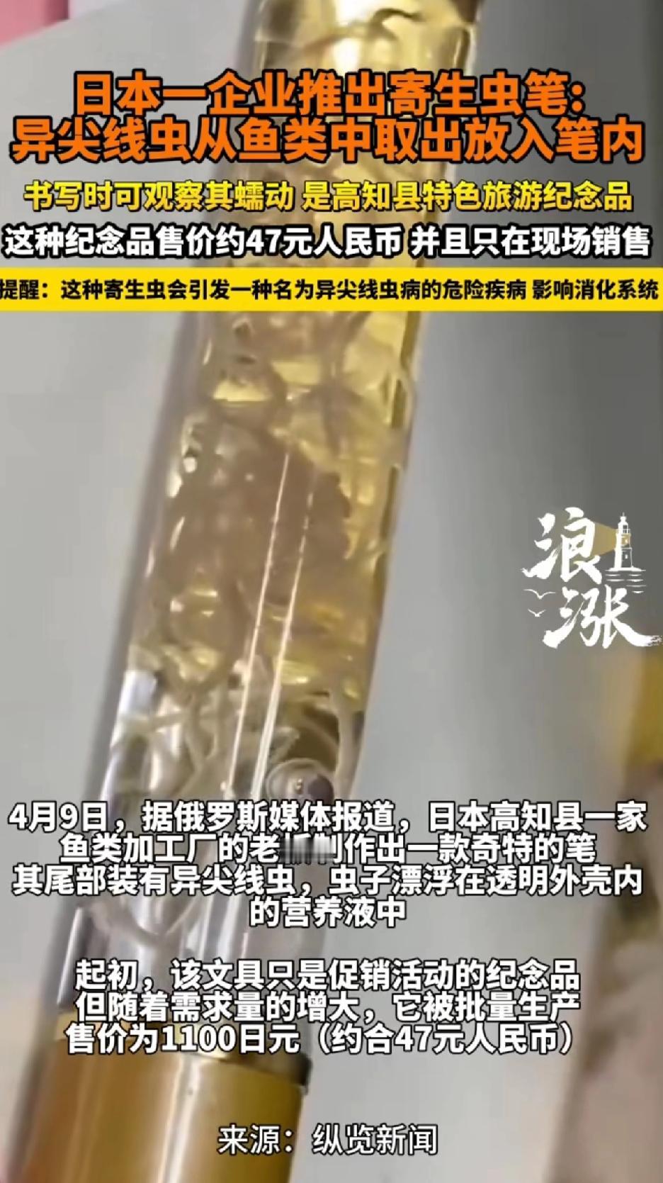 这笔出自当地公司多田水产,灵感源于2021年社交媒体上有人把从胃里提取的异尖线虫放进笔里。要知道,吃了含这种寄生虫的生鱼或未煮熟的鱼,可能会食物中毒。