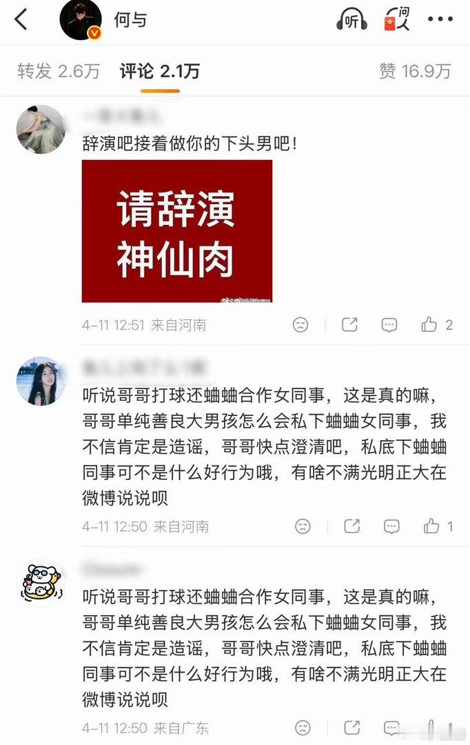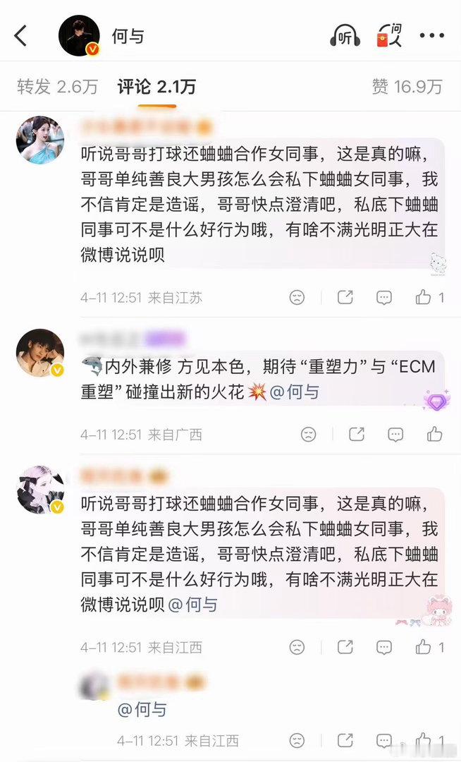 何与朋友晒何与王鹤棣打球照,何与朋友不仅回复网友还点赞“一起蛐蛐差不多,还情敌”的评论,之后还把主页背景换成了鳄鱼,现在虞书欣粉丝要何与辞演神仙肉~