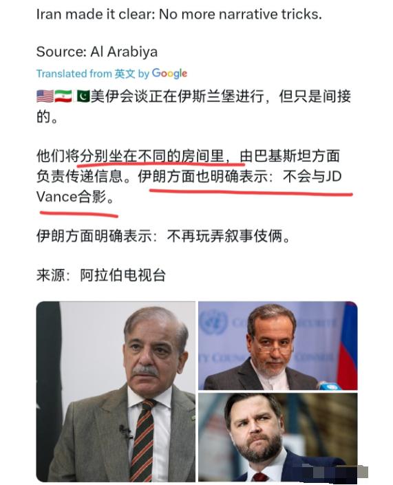 伊朗这招是真绝,这是一点都不给美国操作的机会!4月10日,根据外媒报道,美国与伊朗在伊斯兰堡举行会谈,但谈判仅为间接谈判。因为双方将分处不同房间,由巴方人员往返传递信息。伊朗方面还明确表示:拒绝与万斯同框合影。伊朗强调:不接受任何舆论操弄把戏。