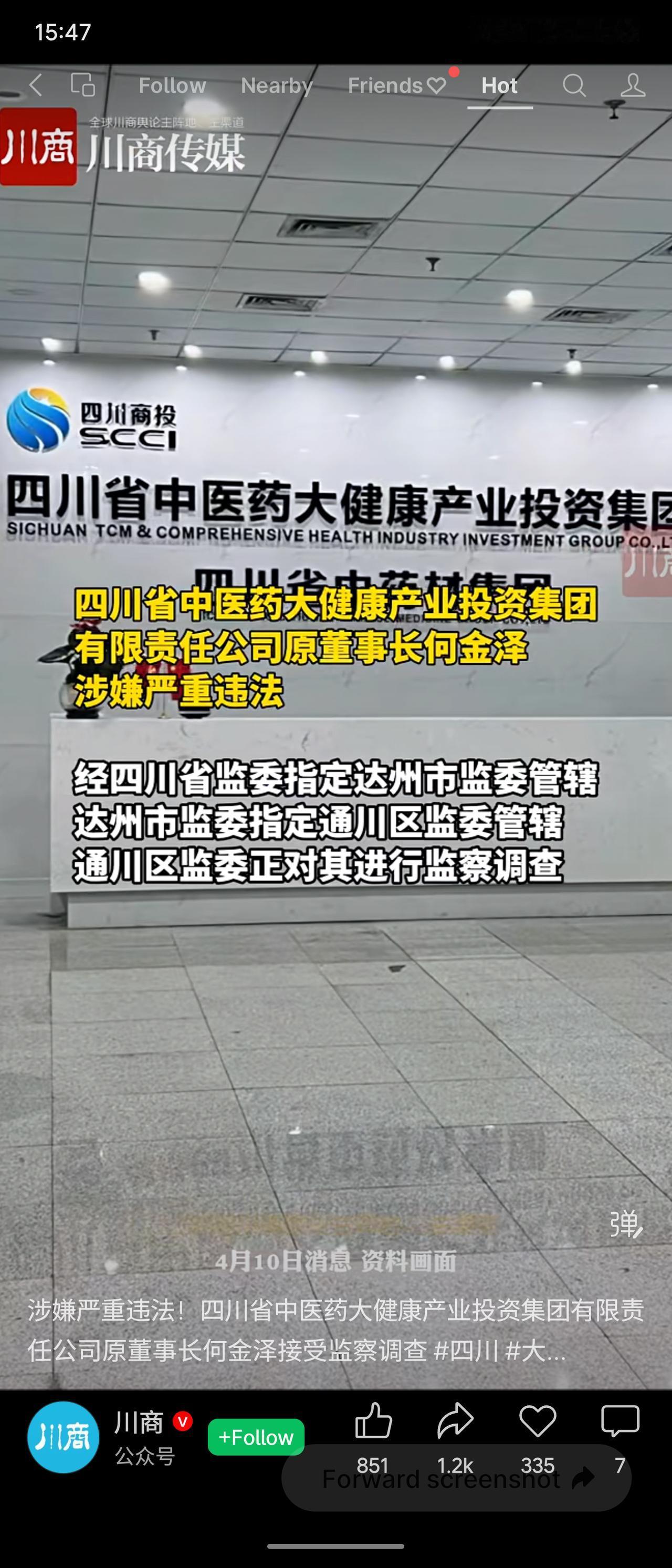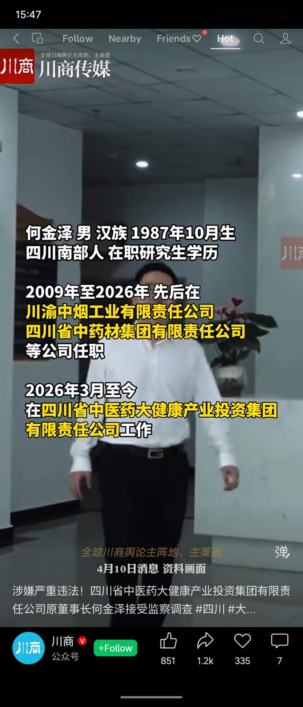 何金泽,男,1987年10月生,四川南部人。曾任职于川渝中烟、四川省中药材集团等,2026年3月起在四川省中医药大健康产业投资集团工作(原董事长)。4月10日通报,其涉嫌严重违法,经四川省监委指定达州市监委、通川区监委管辖,正接受监察调查。