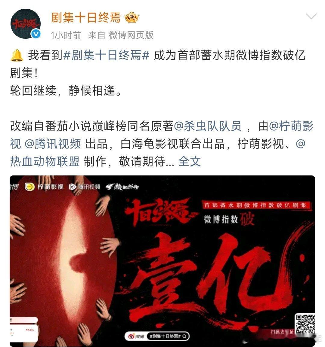 十日终焉微博指数破亿十日终焉开拍第二天发战报还是创造历史记录的战报🔥不愧是肖战 !都来蹭蹭这个未来大爆剧十日终焉微博指数破亿