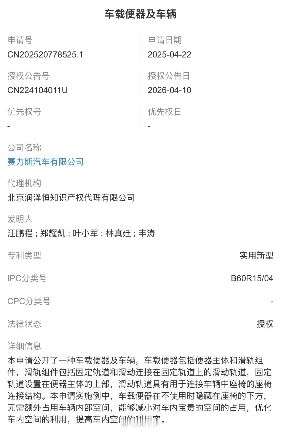 赛力斯车载坐便器专利授权2026年4月10日,赛力斯汽车“车载便器及车辆”实用