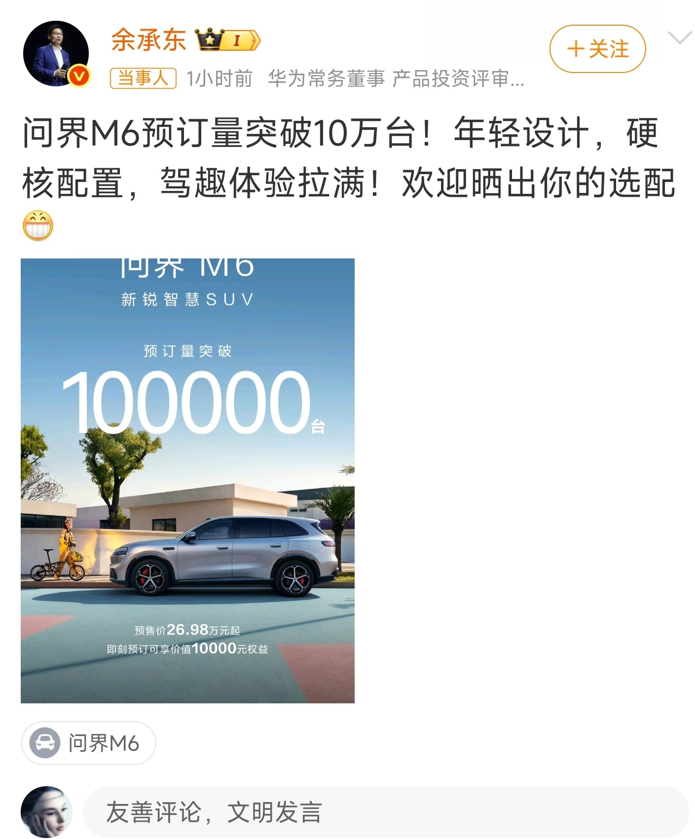 问界M6预定10万台,不知道现在还有谁宣传小订的。24小时6万台,18天10万台