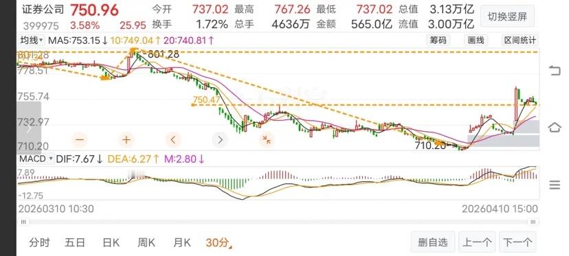 从30分图看,周五虽冲高回落,但没有结束信号出现。虽然冲高回落,但还是挺强的,下周继续看高一线,压力看801。