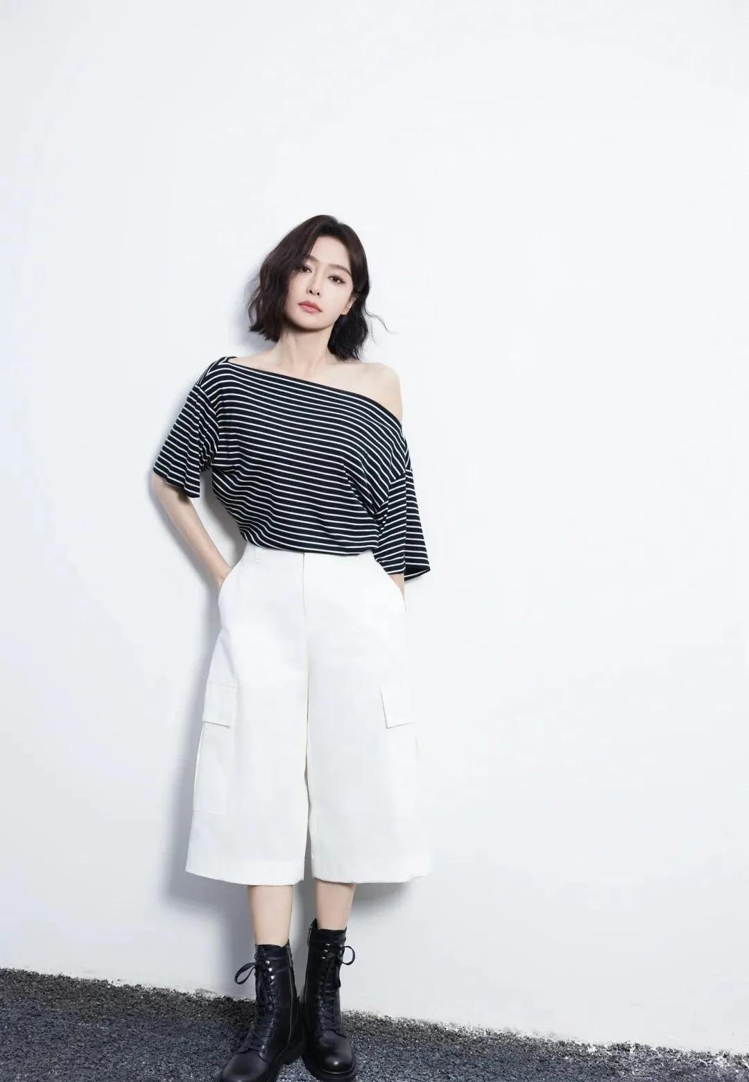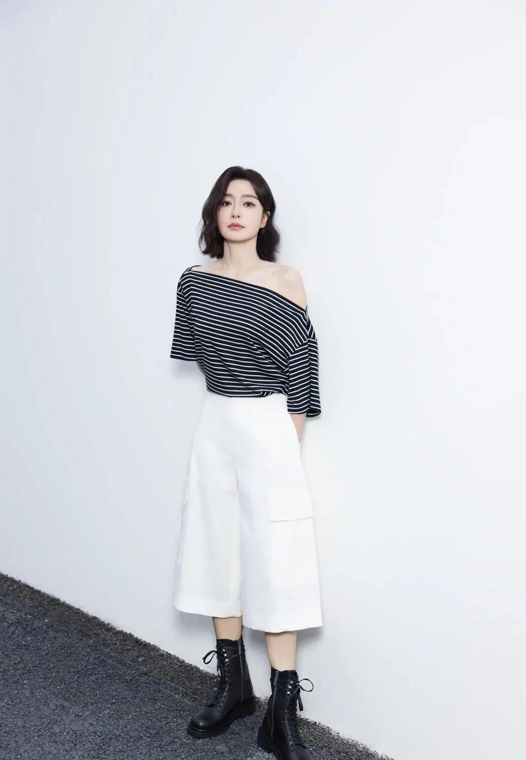 岚这身穿搭直接封神! 斜肩条纹衫露肩又显瘦,搭配白色阔腿七分裤, 简约高级感拉满