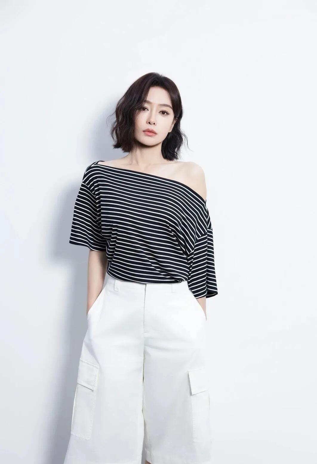 秦岚 明星穿搭 斜肩条纹衫 中年穿搭