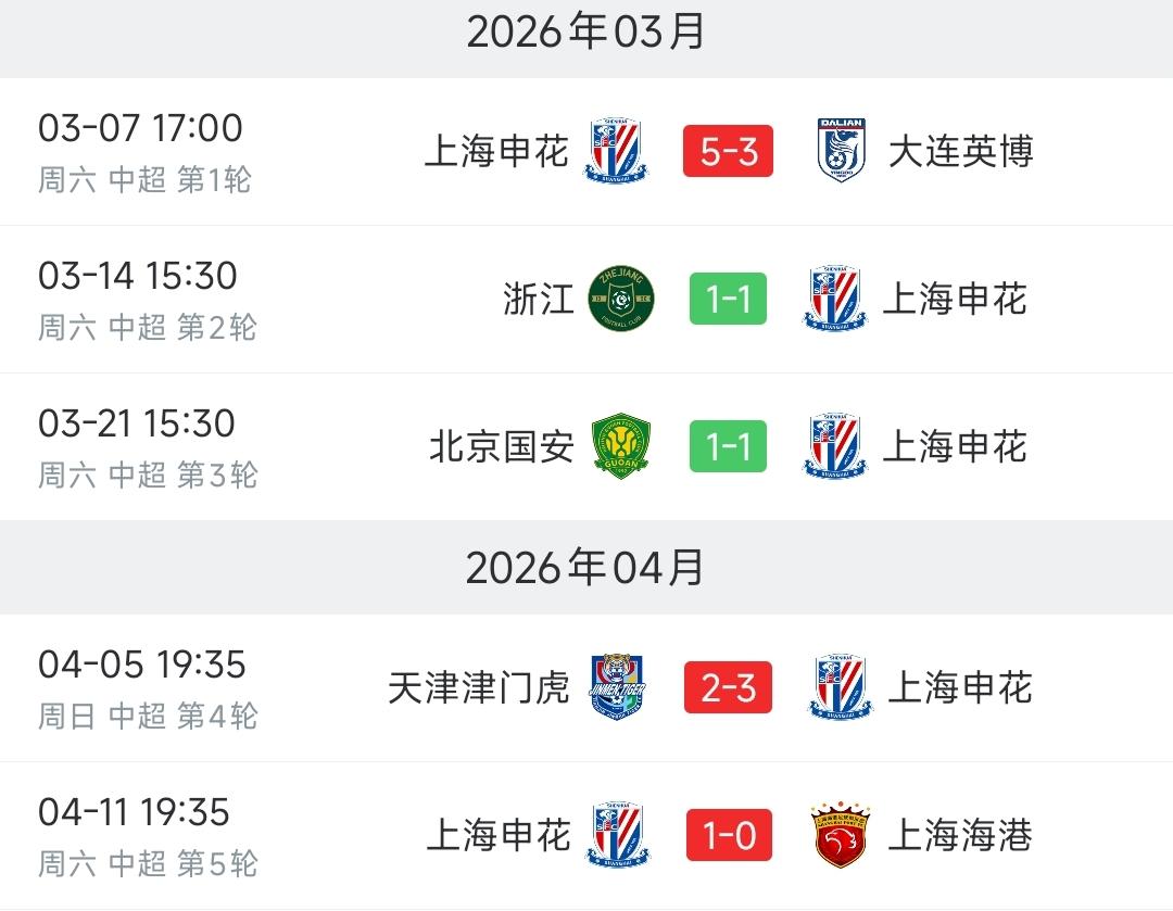 在今晚以1-0的比分赢下了同城对手上海海港后,申花也凭借上海德比的胜利,将本赛季的不败纪录刷新到了5场,目前他们三胜两平,保持不败。