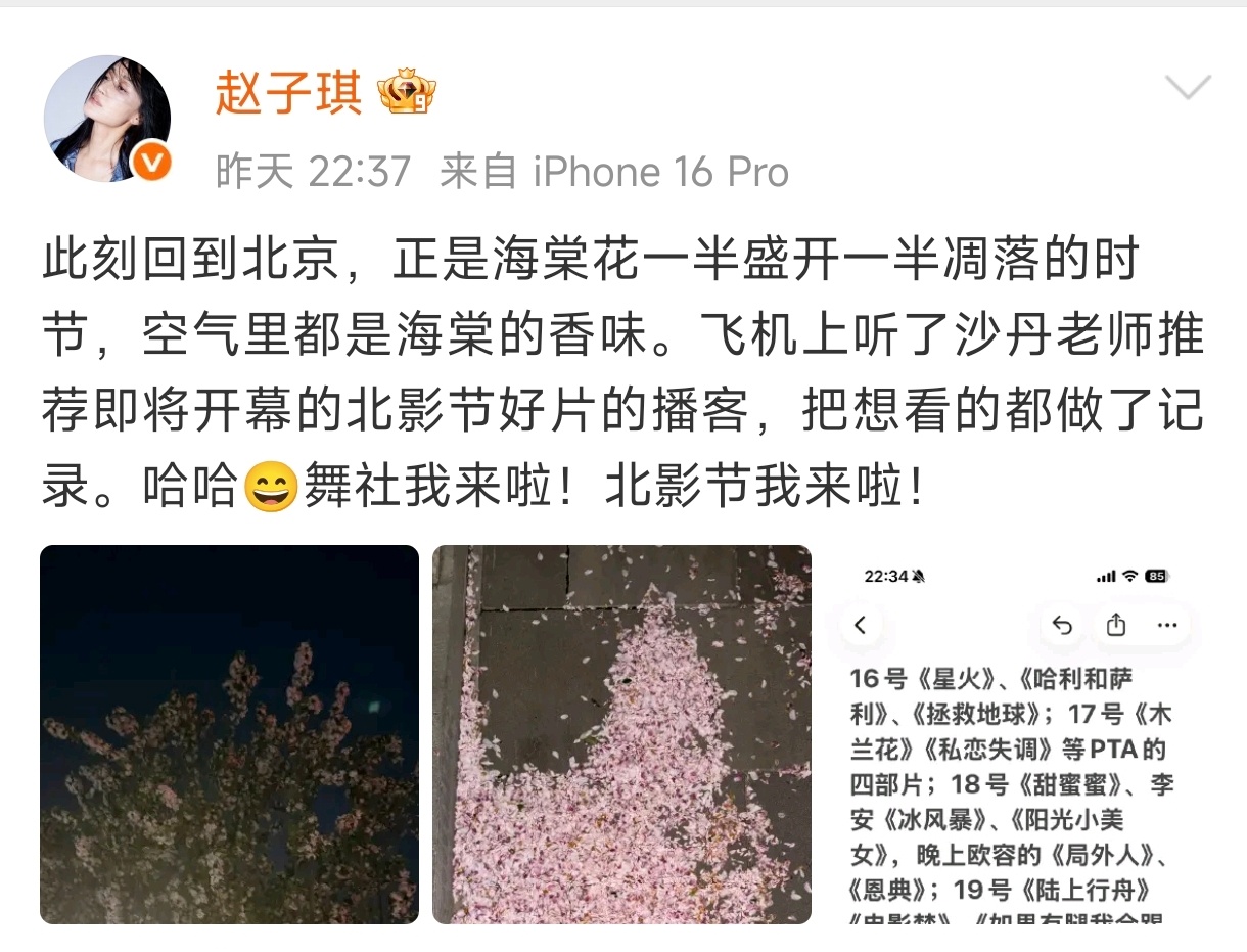赵子琪离开浪姐被北影节吸引赵子琪把北影节想看的都记录了淘汰从不定义精彩,赵子琪在离开浪姐后被北影节好片吸引,用心记下每一部想看的电影,直接规划出9天完整看片行程,在电影世界里感受不同故事,活出松弛又自在的状态。