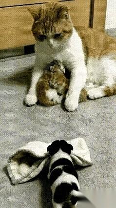 猫妈低头,挨个舔了一遍,舔到小狗这儿,舌头顿都没顿一下。