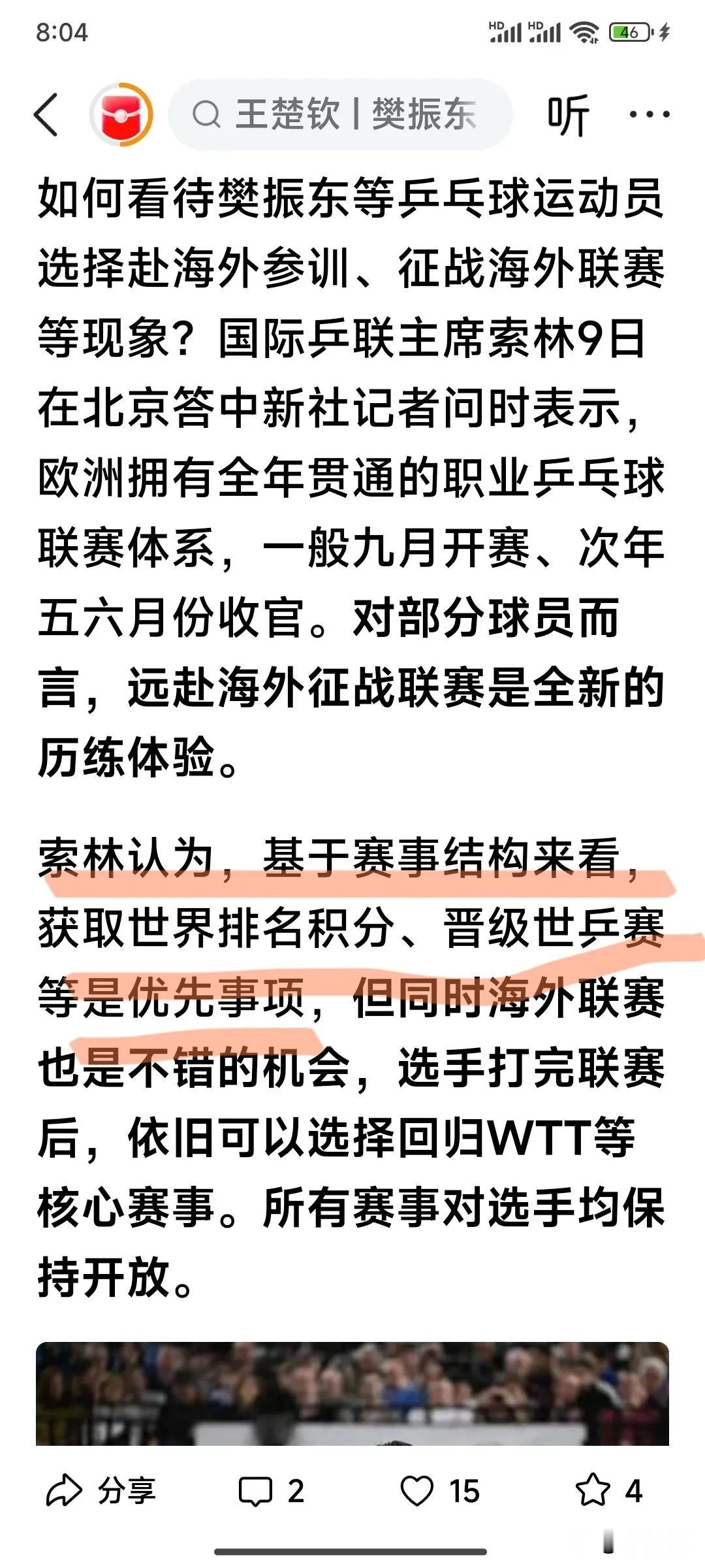 国际乒联主席索林又说: