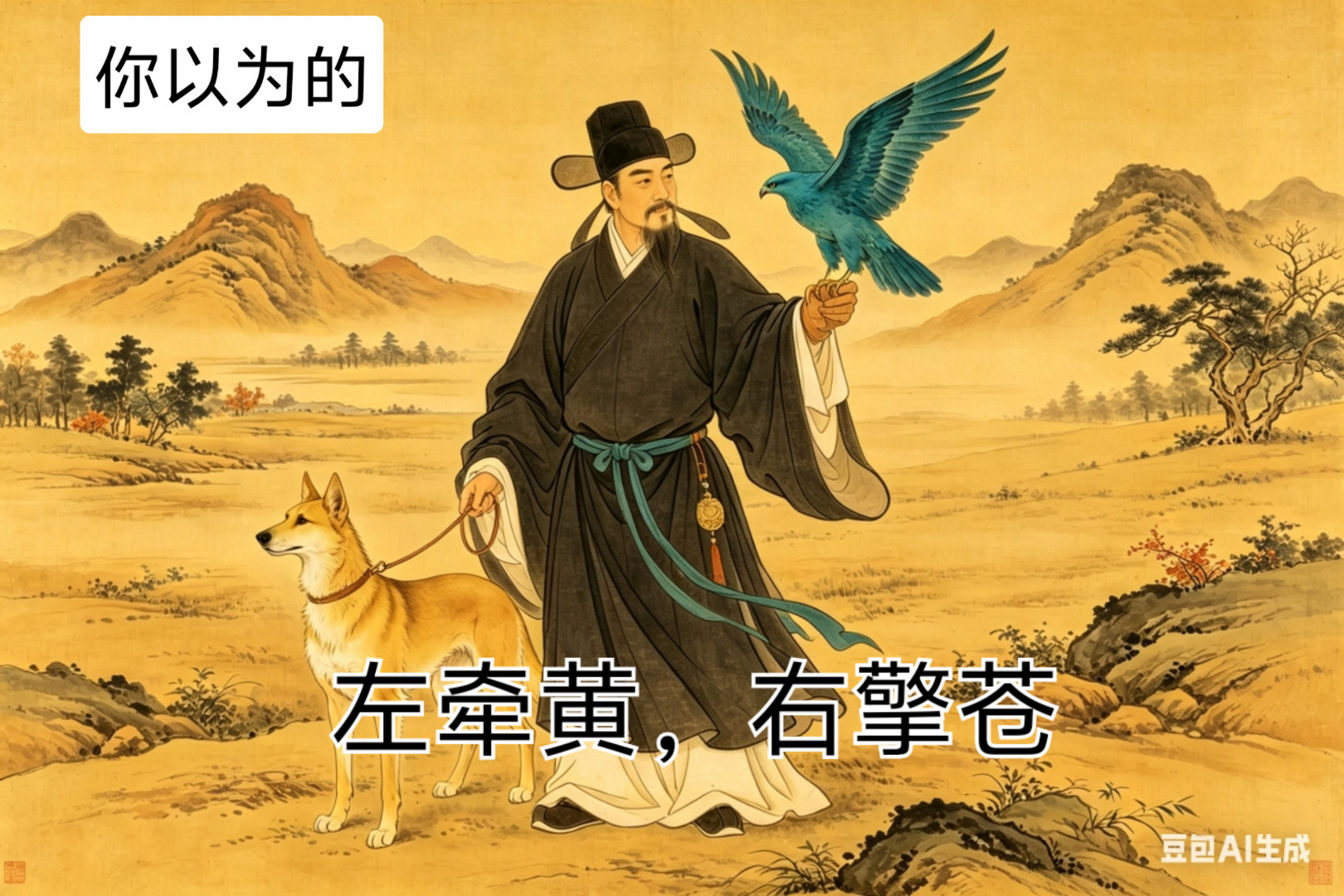 突然想到一件事,苏轼那么抽象的人,和黄庭坚,石苍舒又是好友,那么“左牵黄,右擎苍”有没有可能其实牵的是黄庭坚,擎的石苍舒,就和现在男生之间喜欢称兄弟为儿子一样