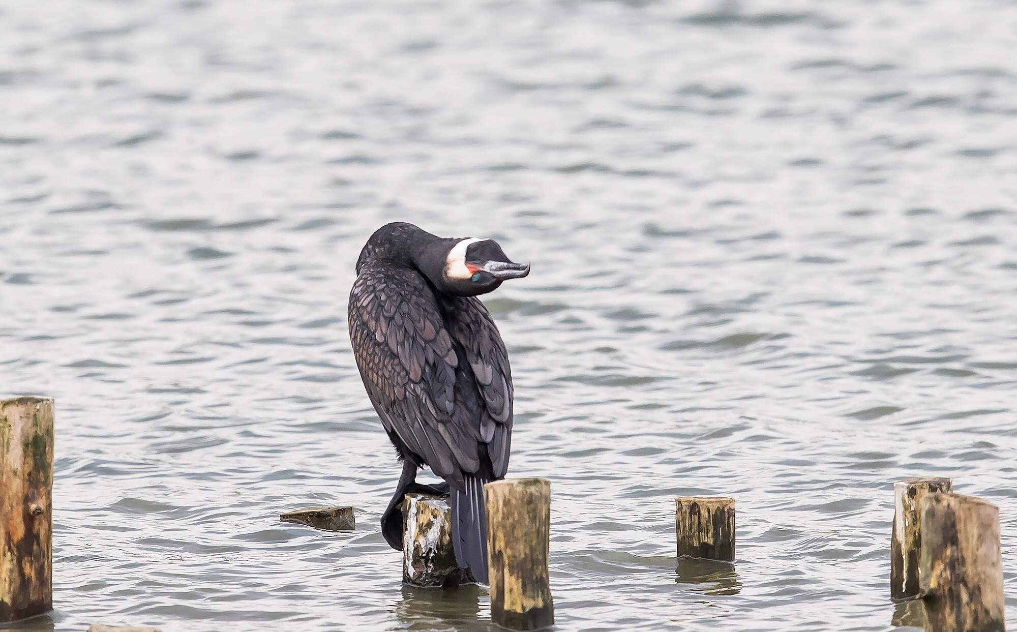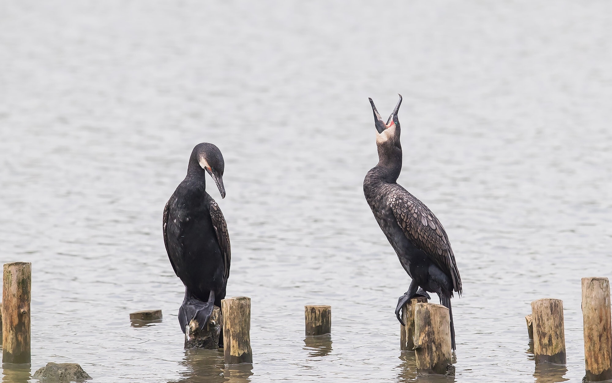 这鸟可太会捕鱼了,天生的水鸟猎手,羽毛防水性差,所以总爱晒翅膀,不过那天这俩可没闲着,一会儿抢木桩地盘扑棱得水花乱飞,一会儿凑一块儿嘴碰嘴,还有一只仰着脖子不知道是在打哈欠还是跟同伴示威,给我看乐了!