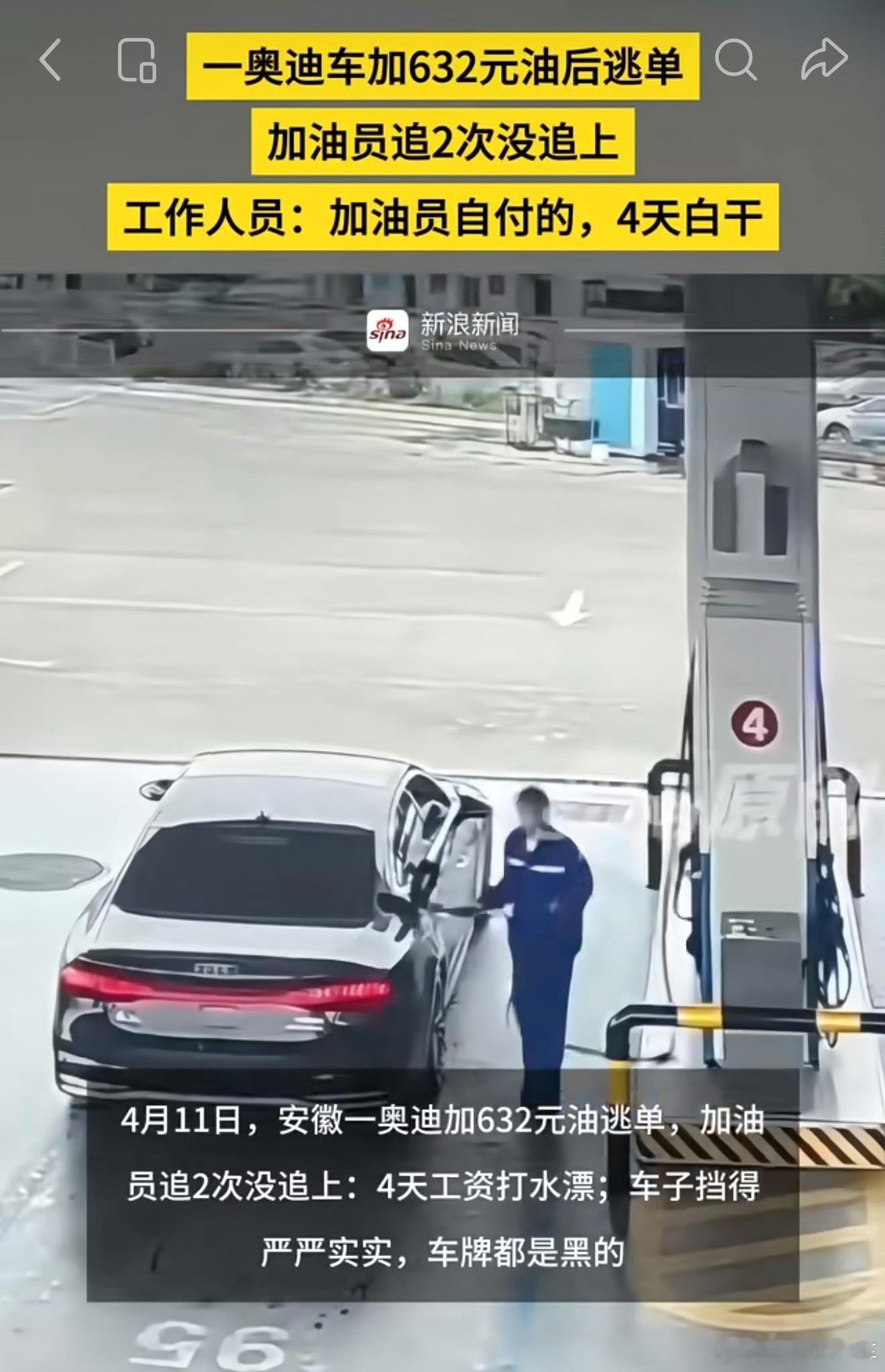 奥迪逃单加油站员工垫付4天工资前有路虎加油逃单被抓,现在又来个奥迪逃单也被逮了,这些人这么不要脸吗?600 多块人家加油员四天白干了。
