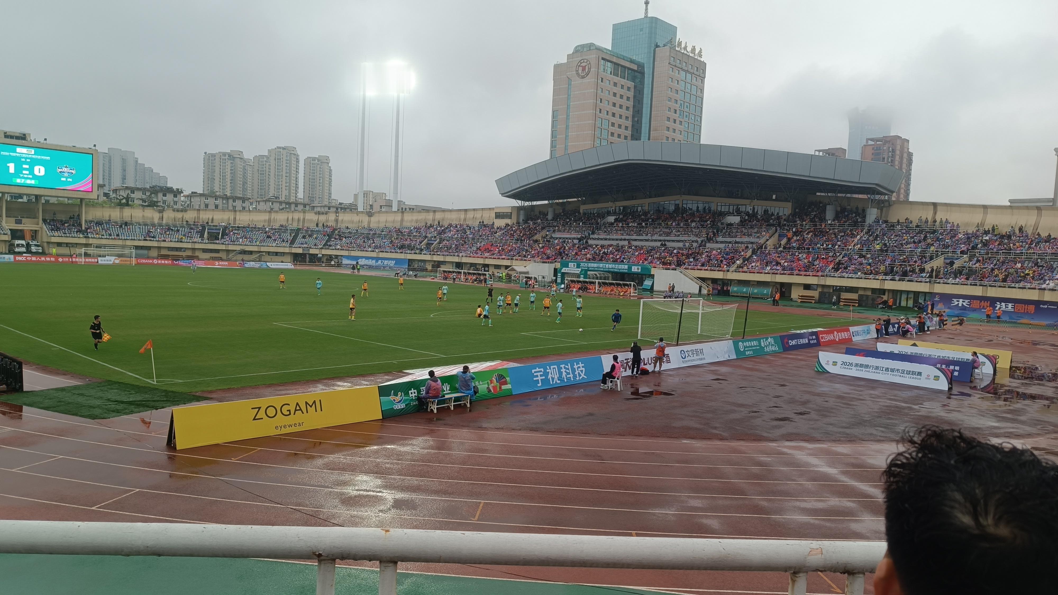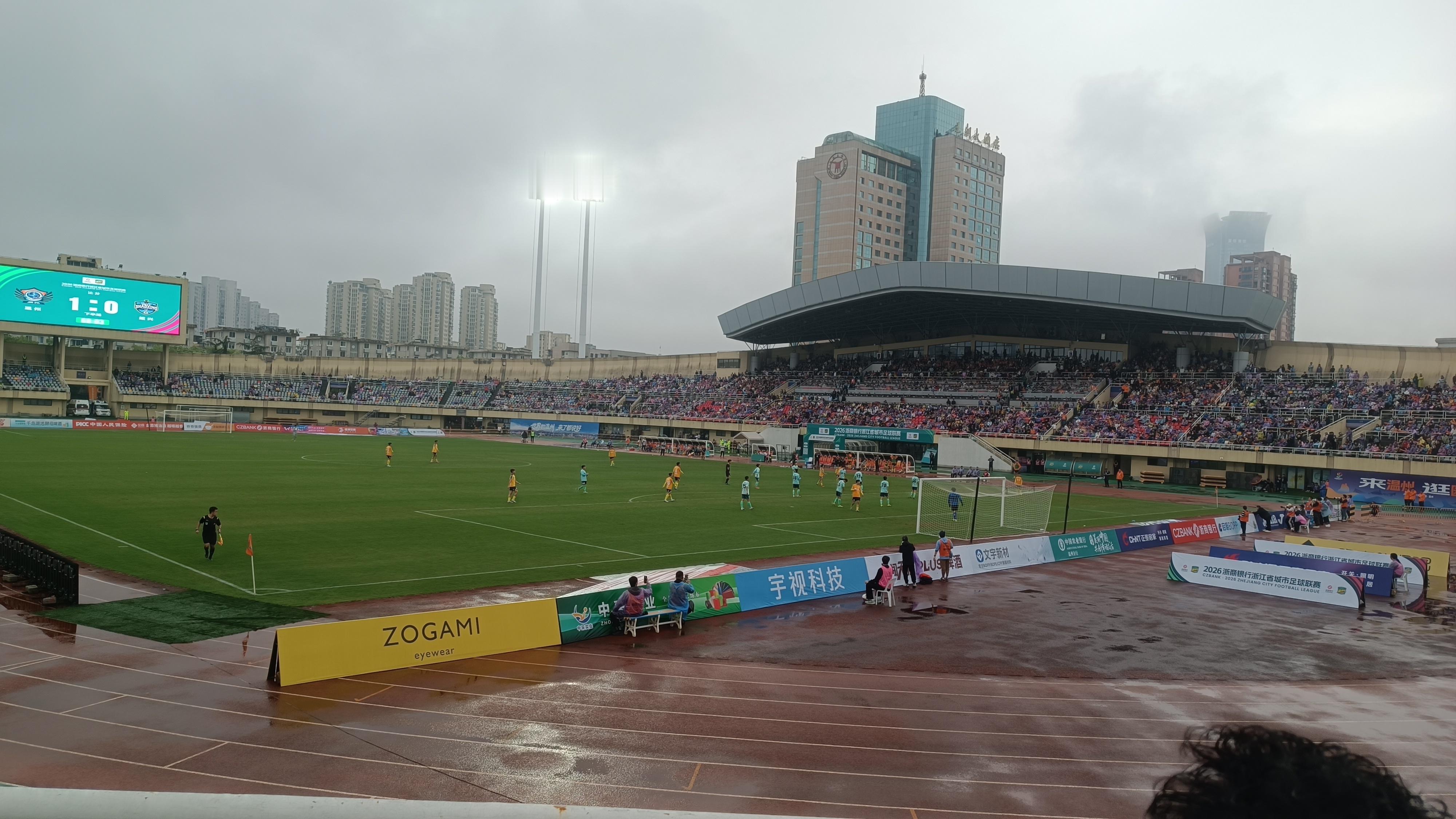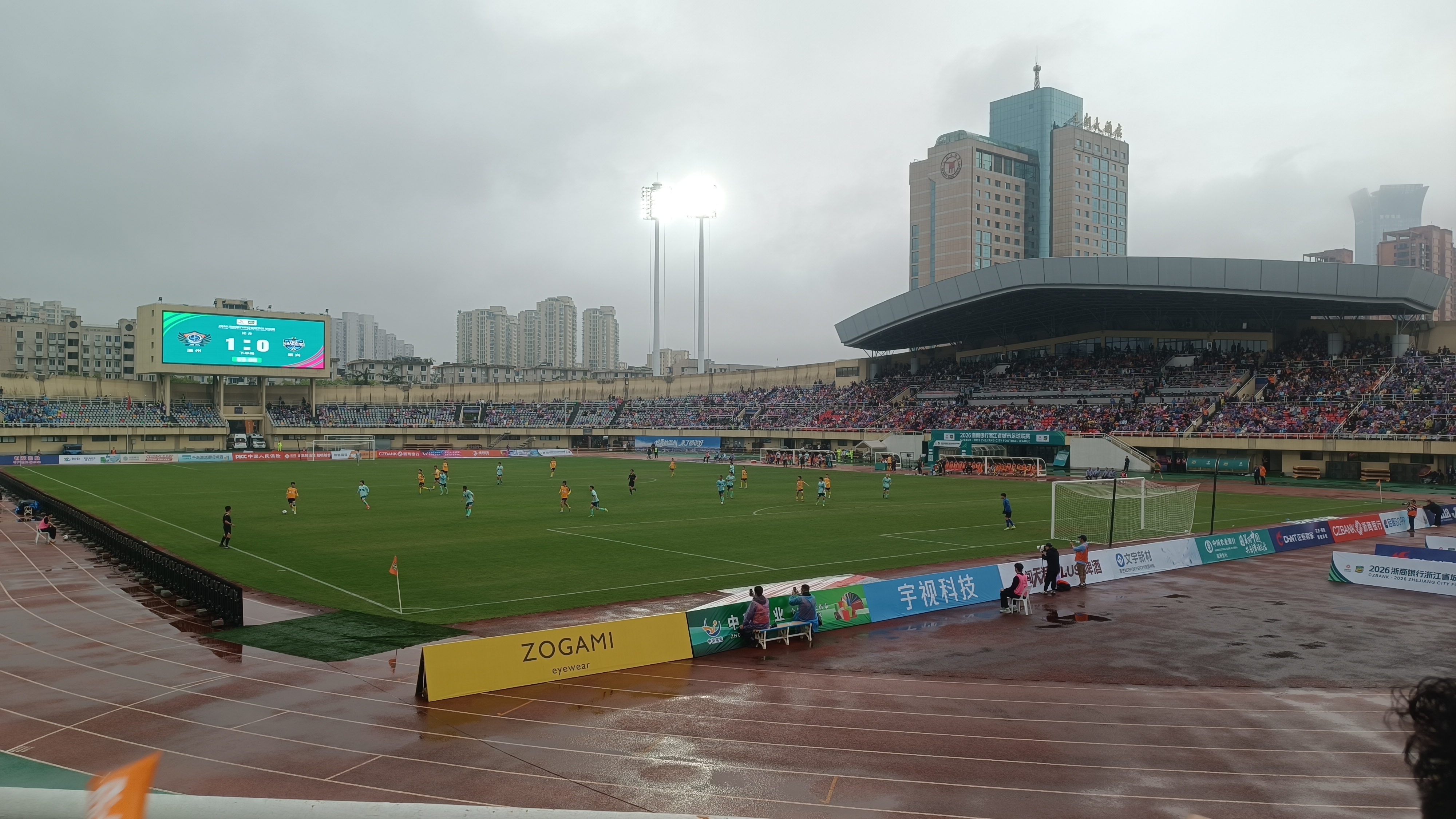 半场哨响,温州主场1:0小胜绍兴,雨水浸透看台,热情却未降温。球场灯光穿透阴云,球员在湿滑草地上拼抢如风,观众席呐喊声浪不减。背景高楼静默守望,见证这场浙南德比的激烈角逐。记分牌定格1:0,悬念留待下半场。浙江足球的热血,在雨中更显纯粹——为家乡球队喝彩,为吴越杯激情燃爆温州!⚽️🌧️ 温州·温州体育中心
