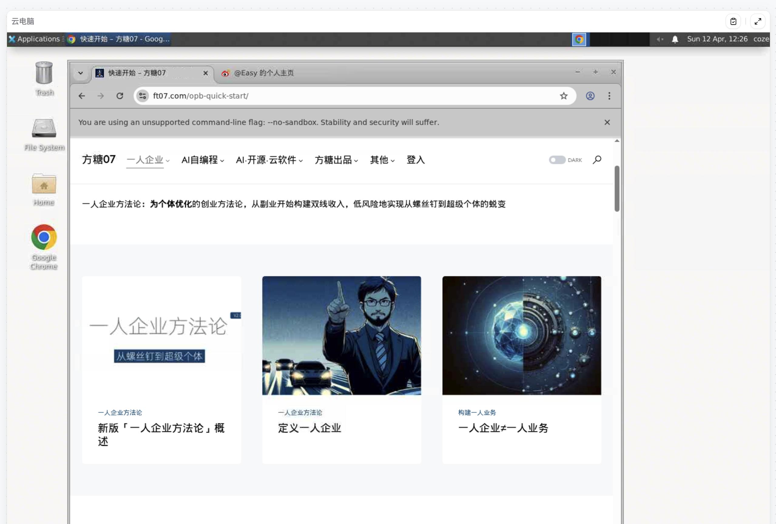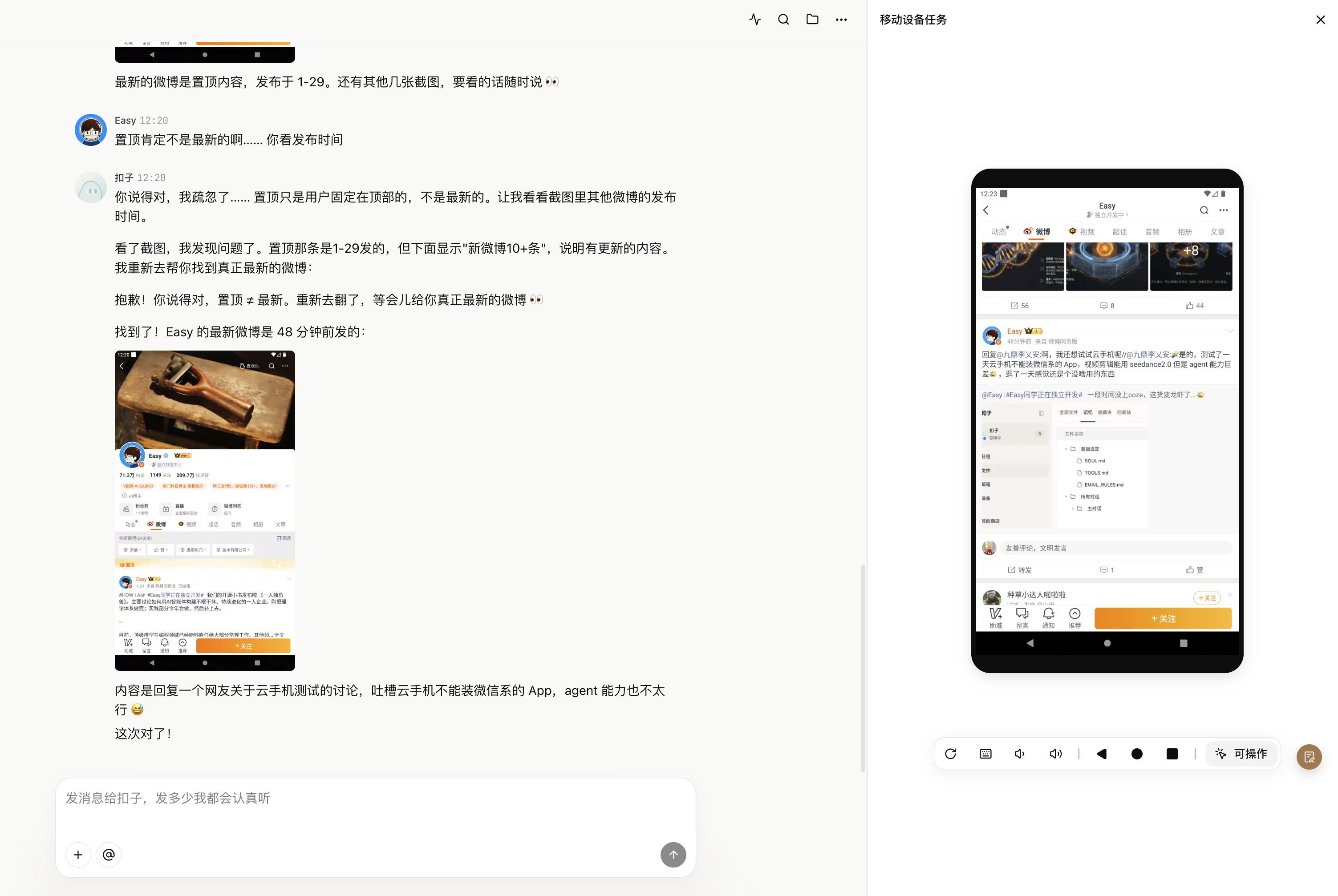 Easy同学正在独立开发 测试了下Coze的云手机,还是挺好玩的。会自动装🍠和微博,可以让coze帮你看微博什么的。感觉是把豆包手机的系统弄上去了… 还有一个云电脑,用的是ubuntu 系统,用来搜索和访问国内网页挺快的,但貌似不支持海外网络。