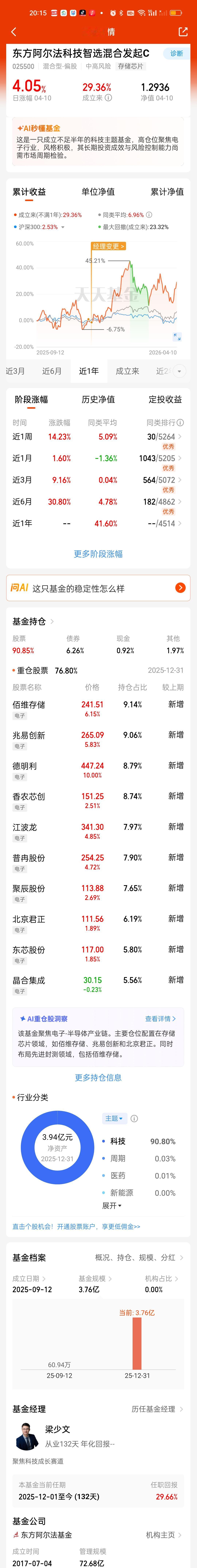这3只纯血存储芯片基,从规模来看,先锋最大,接近百亿,而且全都在第四季度增加的。这也说明它当时的热度是非常高的。阿尔法科技3亿多排在第二,方正富邦不足1亿规模最小。从前十大重仓股占比来看,方正富邦76.80%,先锋79.32%,东方阿尔法76.80%,先锋占比最高,持仓风格最激进。从收益表现来看,基本是半斤八两,差不了太多。