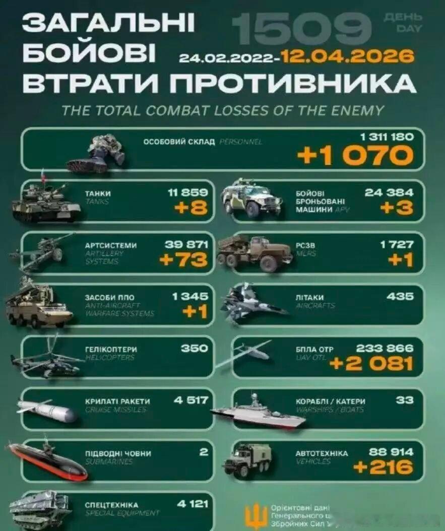 乌俄战争进入第1509天,乌克兰总参谋部发布战报:过去24小时俄军发动进攻103次,其中16次在胡利亚伊波列(27次在苏梅)、19次在康斯坦丁诺夫卡、10次在利曼、26次在波克罗夫斯克、5次在南顿涅茨克区域。毙伤俄1070名。俄军累计损失1311180人。摧毁俄8辆坦克、3辆装甲车、73门火炮、1个火箭发射装置、1套防空系统、2081架大型无人机、216辆军车。