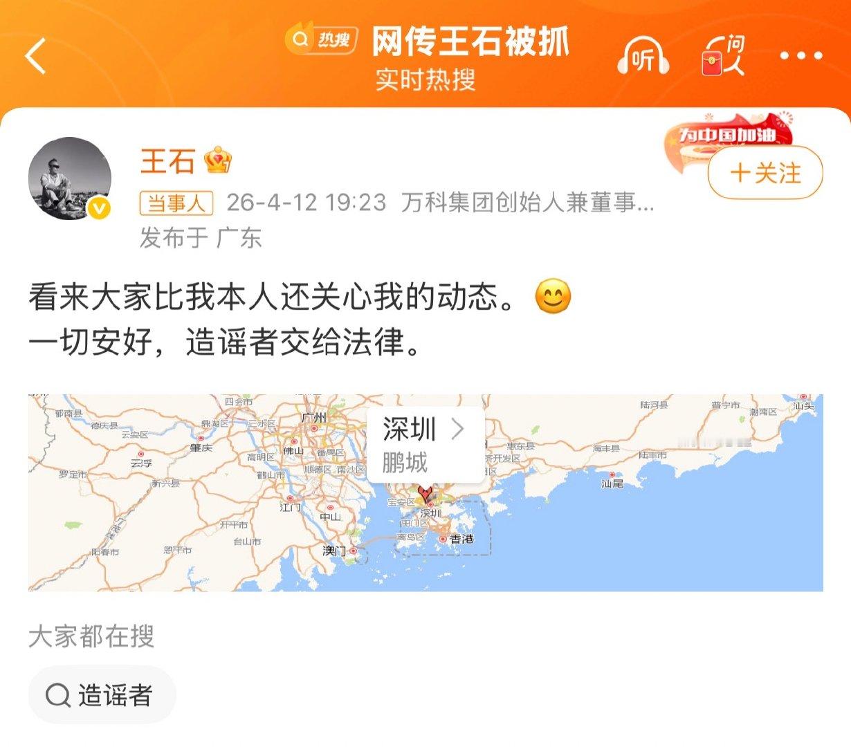 【王石田朴珺IP地址不在一起】4月12日,网传“王石被抓”一事引发关注。对此,田朴珺回应网传王石被抓:这是法治社会,造谣不需要付出代价吗?随后,发博:看来大家比我本人还关心我的动态。一切安好,造谣者交给法律。