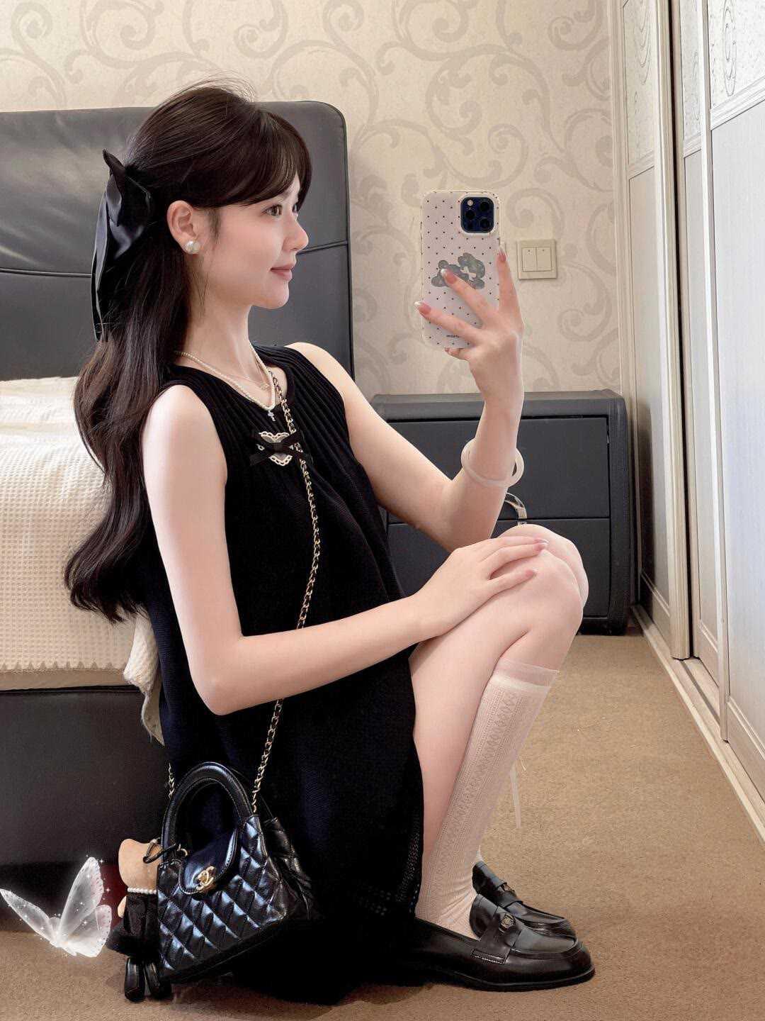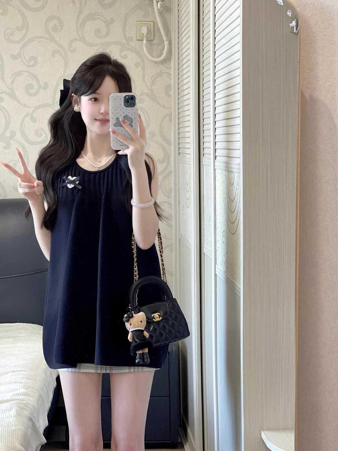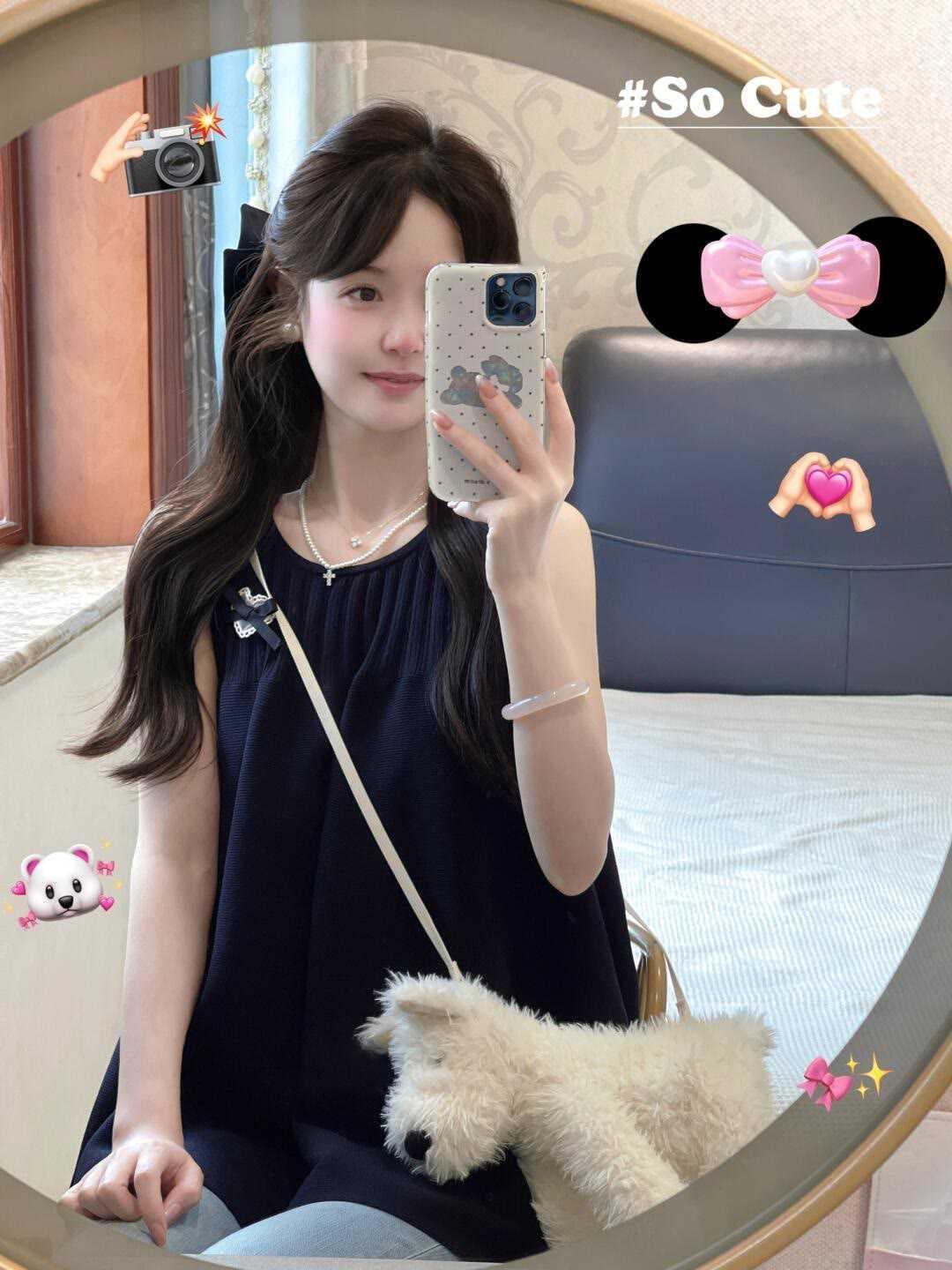 如何穿出精致的少女感?教你用基础款穿出高级少女感!黑色背心简约不简单,竖纹肌理自带质感,搭配浅蓝色牛仔裤,经典黑白蓝配色干净又耐看。珍珠耳钉+细项链点缀颈部,黑色大蝴蝶结发饰温柔吸睛,毛绒包包增添灵动,轻松打造出清爽又精致的夏日少女范儿。