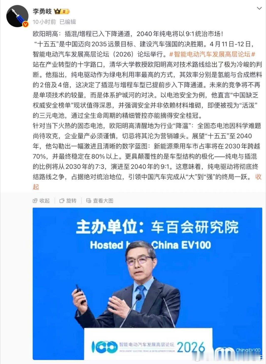 1、未来纯电比例越来越高,2030年高达70%,2040年高达90%-增程的尽头是纯电2、固态电池发展速度远比想象中的慢-纯电的尽头是换电3、未来的竞争是体系化的竞争「斌哥也同样表达过此类观点」4、电池安全值得大家关注