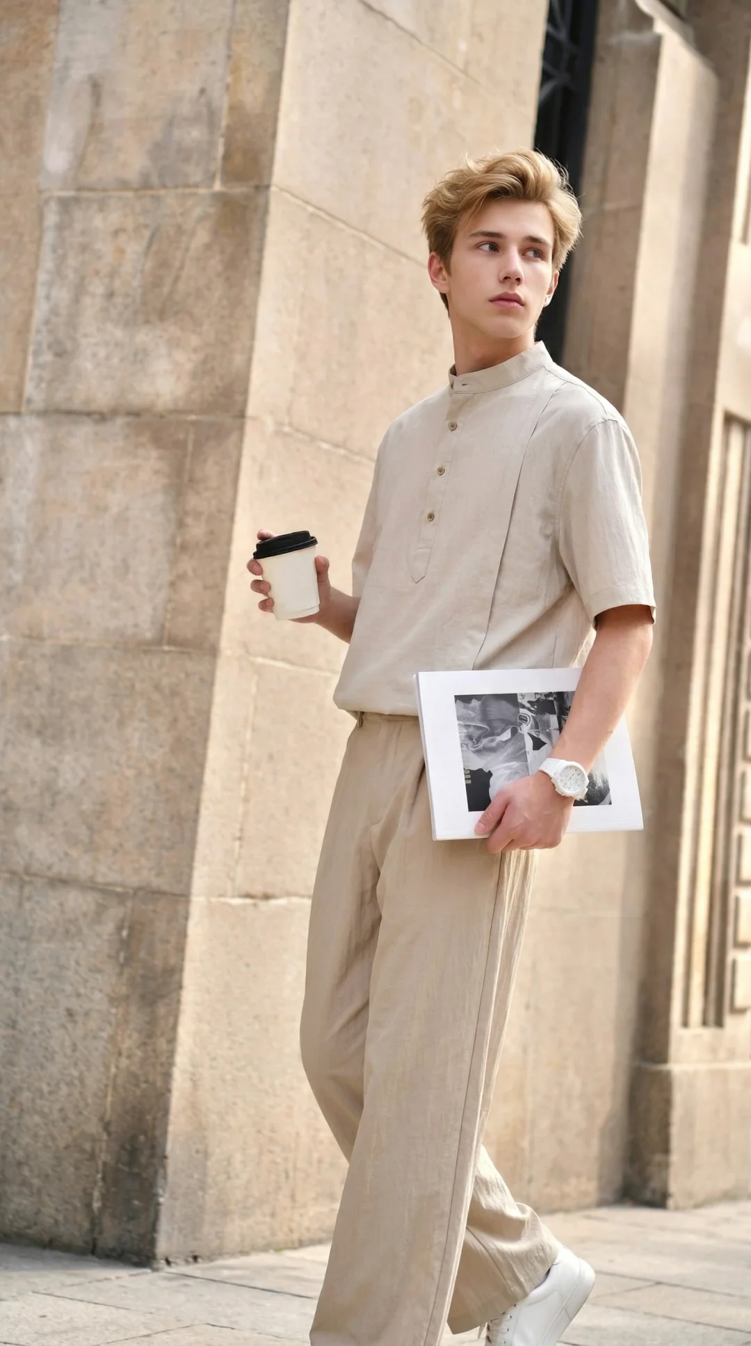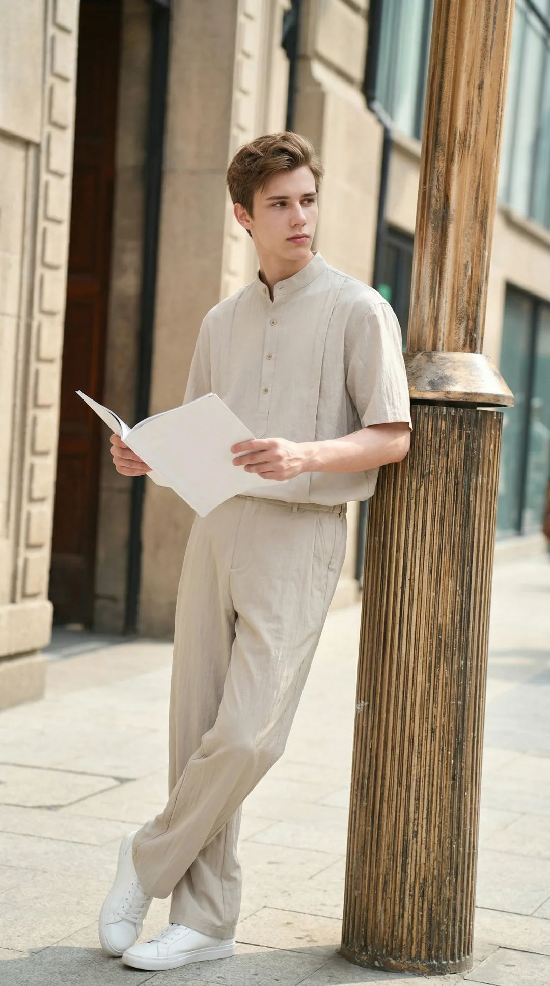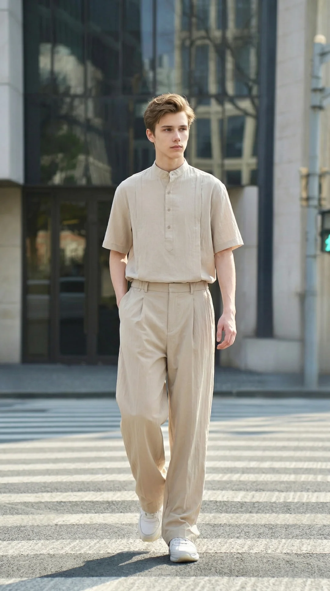 作为天生清瘦的骨架,我偏爱这种带点肌理感的亚麻面料,半开襟立领的剪裁刚好填补了肩线的单薄感,不会像普通 T 恤那样撑不起版型;垂坠的直筒裤又能悄悄优化比例,视觉重心稳稳落在腰线,完全不会有头重脚轻的局促感。低饱和的卡其色自带温柔滤镜,走在老街上,连风都变得松弛起来,完全是不费力的高智感氛围