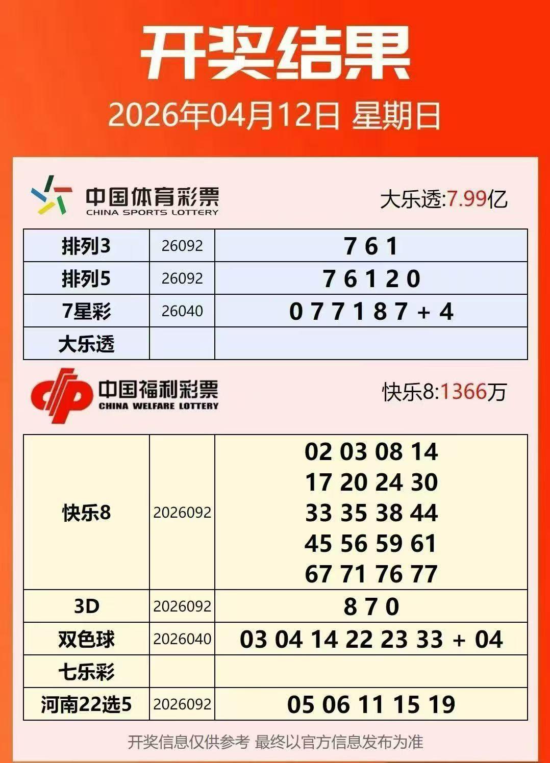 4月12号星期日,双色球开奖号码出炉:03、04、14、22、23、33—04。