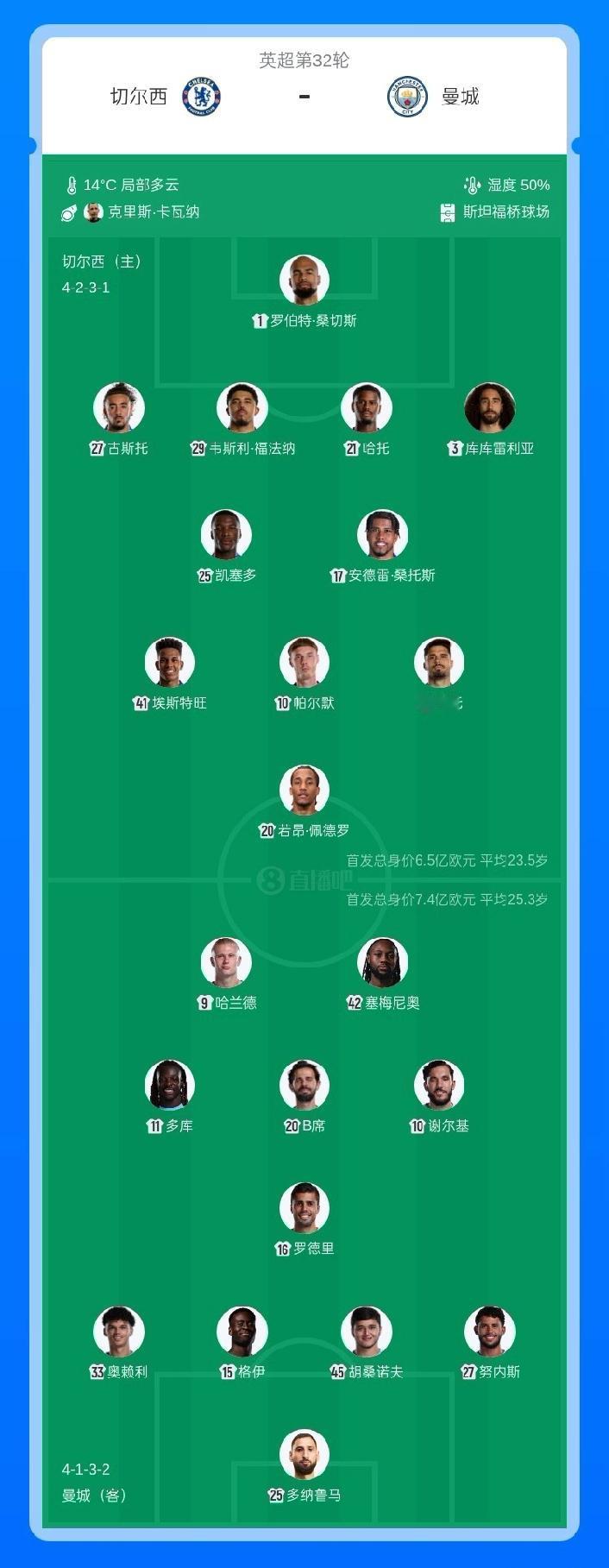04月12日 23:30,英超第32轮,切尔西主场迎战曼城,首发阵容出炉。切尔西方面恩佐继续缺阵,帕尔默、埃斯特旺首发;曼城全员出战,哈兰德领衔,塞梅尼奥、多库、谢尔基出战