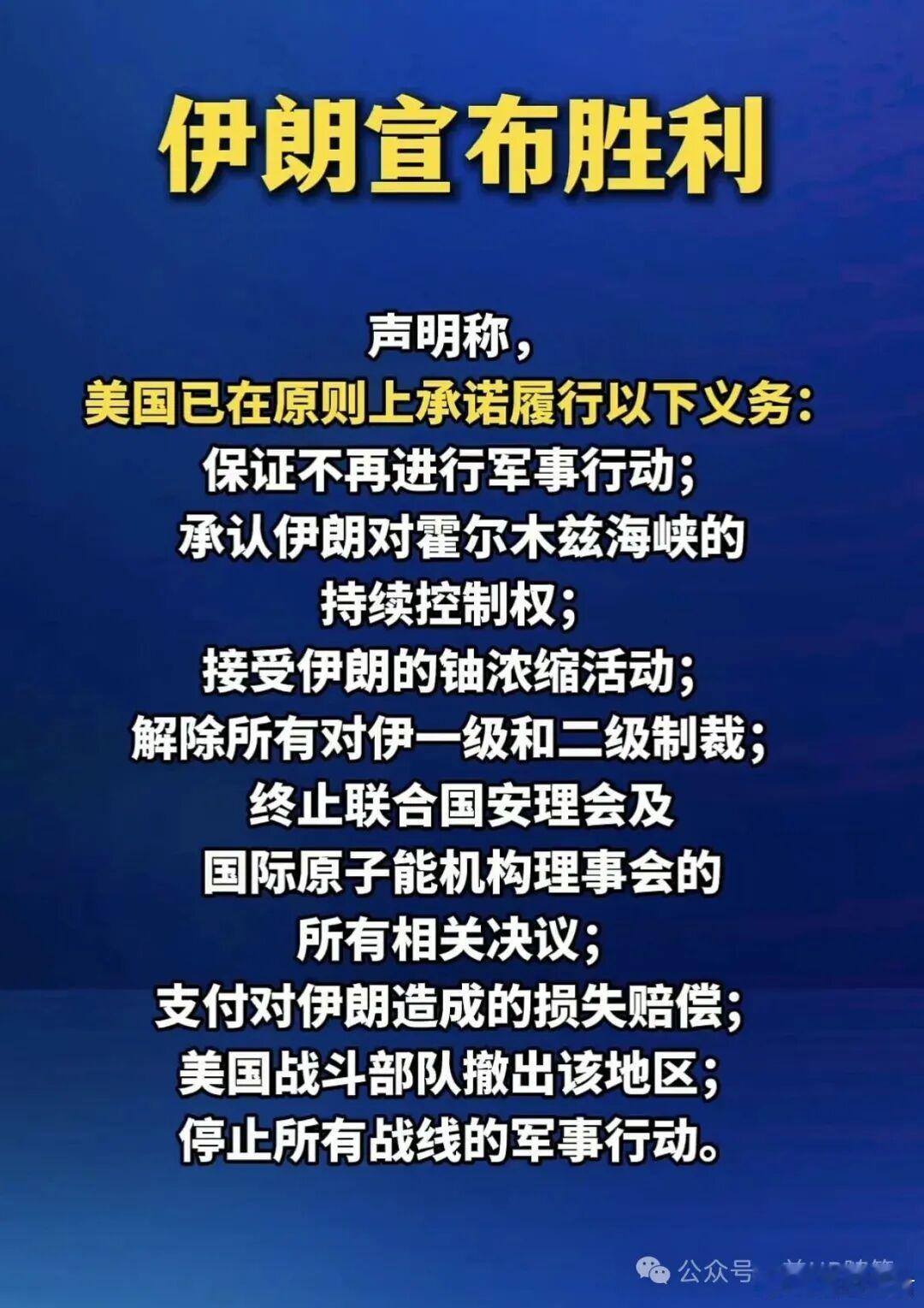 昨天就在特朗普最后通牒倒计时仅剩90分钟、全球屏息看其如何收场时,局势峰回路转,美方同意可按伊朗提出的十条条款谈判并停火两周,谈判定于4月10日在巴基斯坦伊斯兰堡启动。这次临时停火,算是按下战争暂停键,也是各方实力、信誉与利益的重新洗牌。伊朗损失惨重但赢了地位,美国输了信誉,以色列赚了喘息,巴基斯坦赢了声望。不过和平只是暂时的。一、物理损失与国际声望,伊朗损失最大但是光荣,美国信誉崩塌。从战场硬损失看,伊朗本土遭美以持续空袭,能源、军工、科研设施重创,人员与经济代价惨重,账面吃亏明显。但政治与战略层面,伊朗是最大赢家之一就是它以一国之力,硬扛超级大国和地区强权的联合打击,不仅没被打垮,反而逼得美国在其开出的十条停战条件(含美军撤出中东、解除制裁、赔偿损失、确认伊朗霍尔木兹海峡主导权等)基础上妥协停火。一个地区强国彻底打破美国不可战胜的神话,海湾地区头号强国的地位就此坐实 。反观美国,军事投入巨大、盟友离心离德、国内通胀与反战压力飙升,却没能实现特朗普号称的“摧毁伊朗战争能力、控制石油”的核心目标,最后在最后期限前低头妥协,全球信誉遭遇毁灭性打击。国际社会普遍看清美国人那种毫无诚信、出尔反尔、极限施压的套路,这次打伊朗的威慑牌已彻底失效。以色列则是短期最大赢家,停火让其避开伊朗全面报复的风险,获得宝贵喘息与整补时间,继续维持地区军事优势。二、特朗普被迫妥协,根源是战争失控,而且外媒说特朗普团伙空单爆仓,停火是止损而非胜利。特朗普突然同意停火,绝非仁慈,而是内外双重压力下的被迫止损。一方面,战场局势彻底失控,伊朗防空与导弹反击超出美军预期,F-15、A-10等战机接连被击落击伤,C130坠毁;美军基地与舰艇持续遭袭,战争陷入消耗战泥潭,军费飙升、国内支持率跌至战后新低,中期选举压力压顶。另一方面,外媒与市场消息说,特朗普团伙在石油市场的空单爆仓,美伊冲突推高油价至百元上方,做空原油的资本巨亏,再打下去,不仅政治崩盘,经济利益也将彻底归零。所以,所谓同意“停火谈判”,本质是特朗普为保住自身与背后资本利益的紧急止损,随时可能反悔撕毁协议 。三、巴基斯坦斡旋,影响力在中东会进一步跃升。这次停火,巴基斯坦冲锋在前成为破局关键。特朗普公开承认,停火离不开巴基斯坦协调,和平倡议、安理会否决军事授权提案等组合拳,既阻止战争扩大,又推动双方回到谈判桌,赢得全球绝大多数国家赞赏。