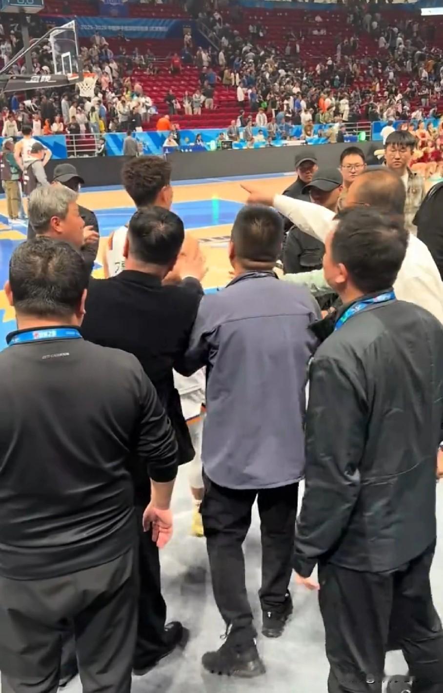 李添荣或收罚单! 客场与北京男篮的比赛,李添荣忽然离开球场走向观众席,但遭到现场