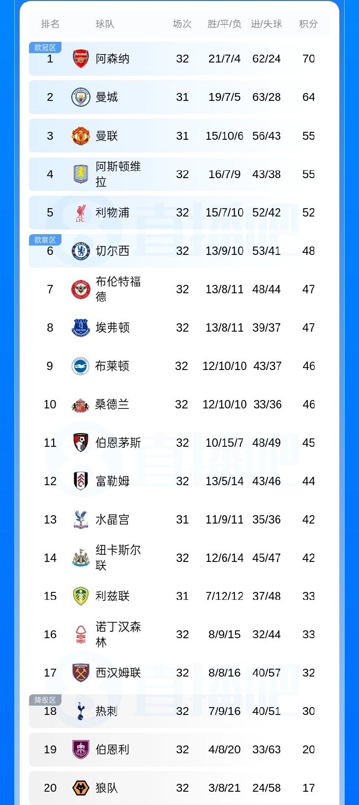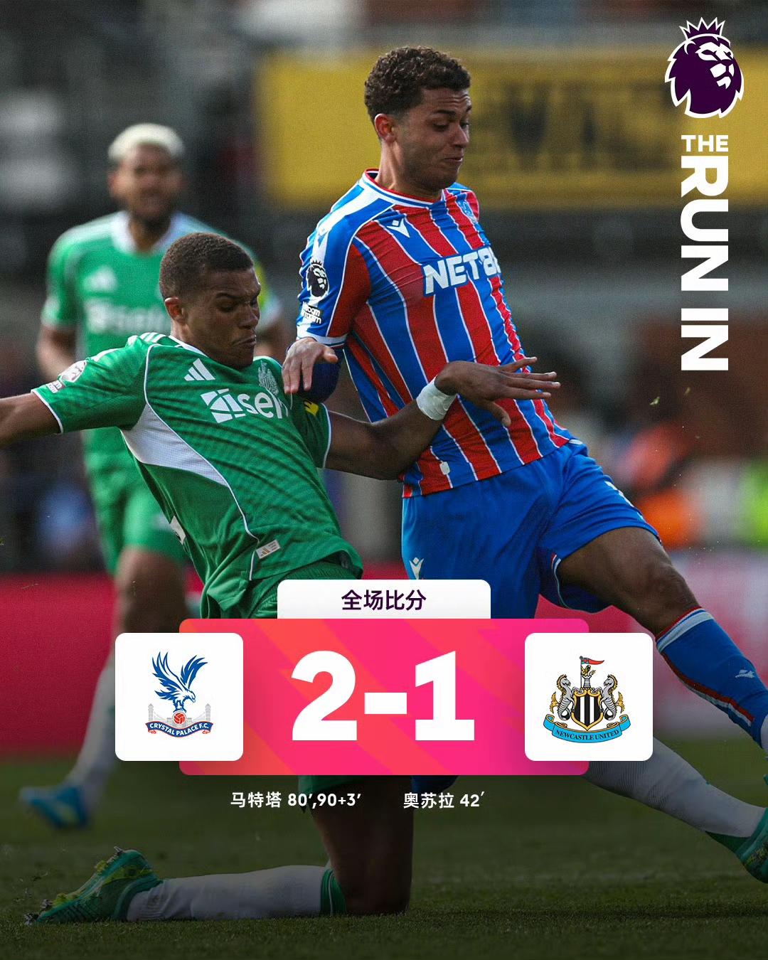 水晶宫2-1击败纽卡斯尔联,水晶宫少赛一场落后第7仅5分,完全有希望冲击欧战名额。