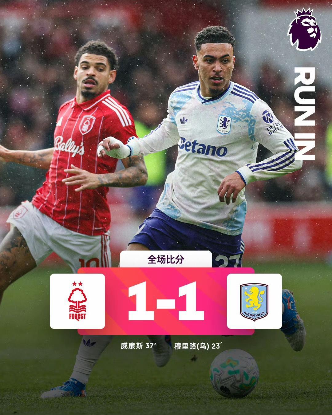 诺丁汉森林1-1逼平维拉,自己收获宝贵的1分,保级路上这1分太珍贵了。