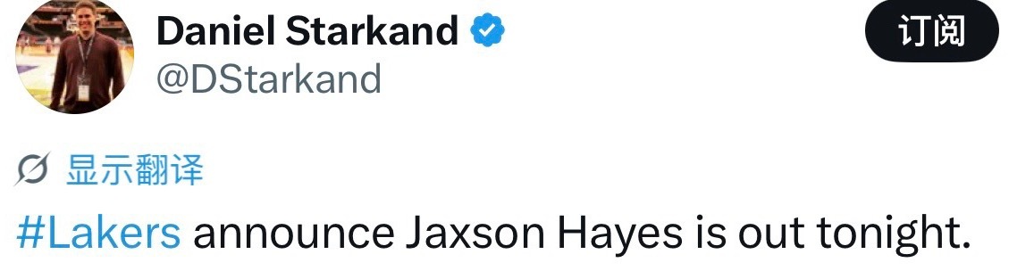 海斯缺席今日比赛