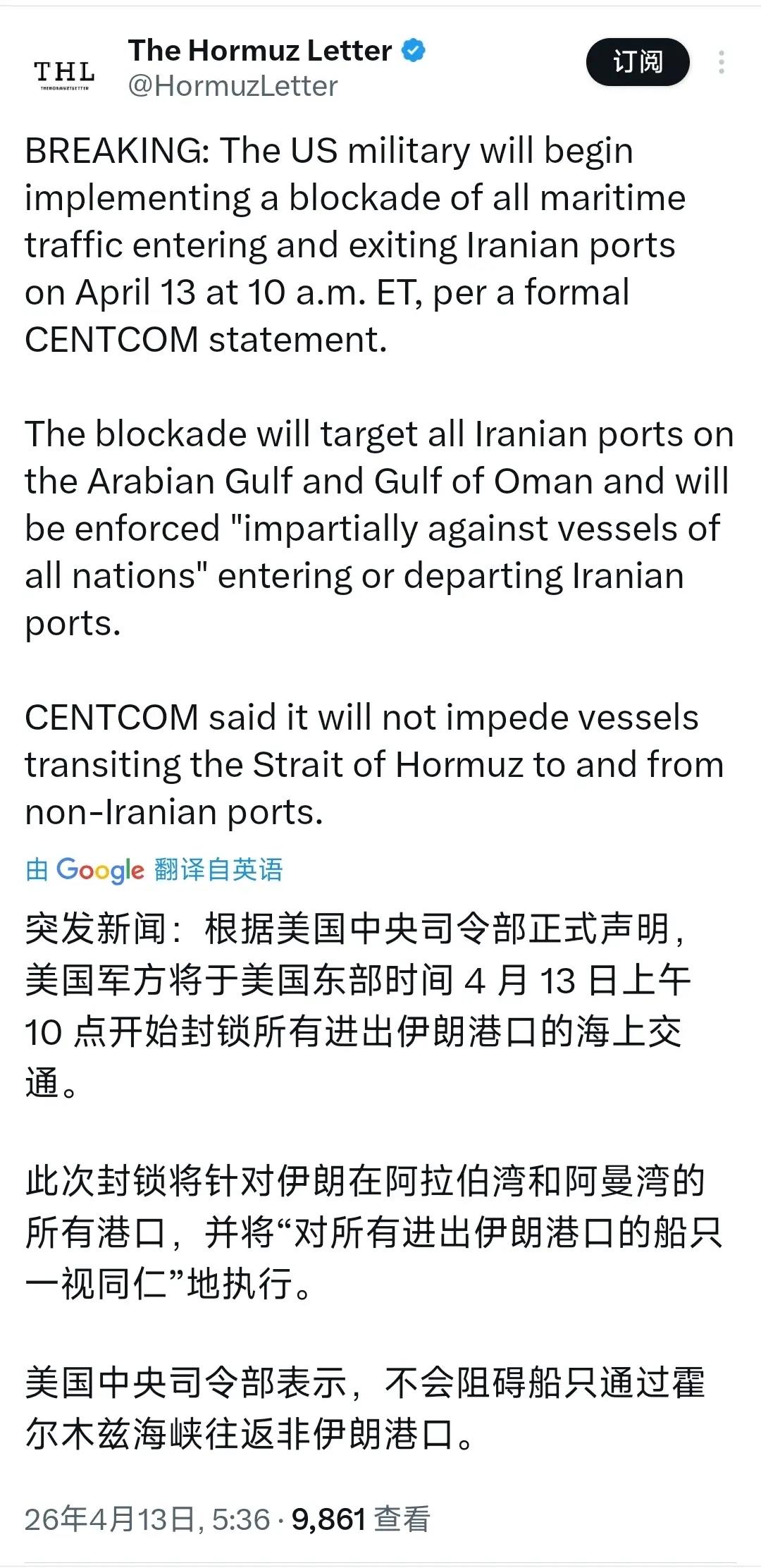 据美国中央司令部发布的正式声明,美国军方将于美国东部时间4月13日上午10点起,对所有进出伊朗港口的海上交通实施封锁。