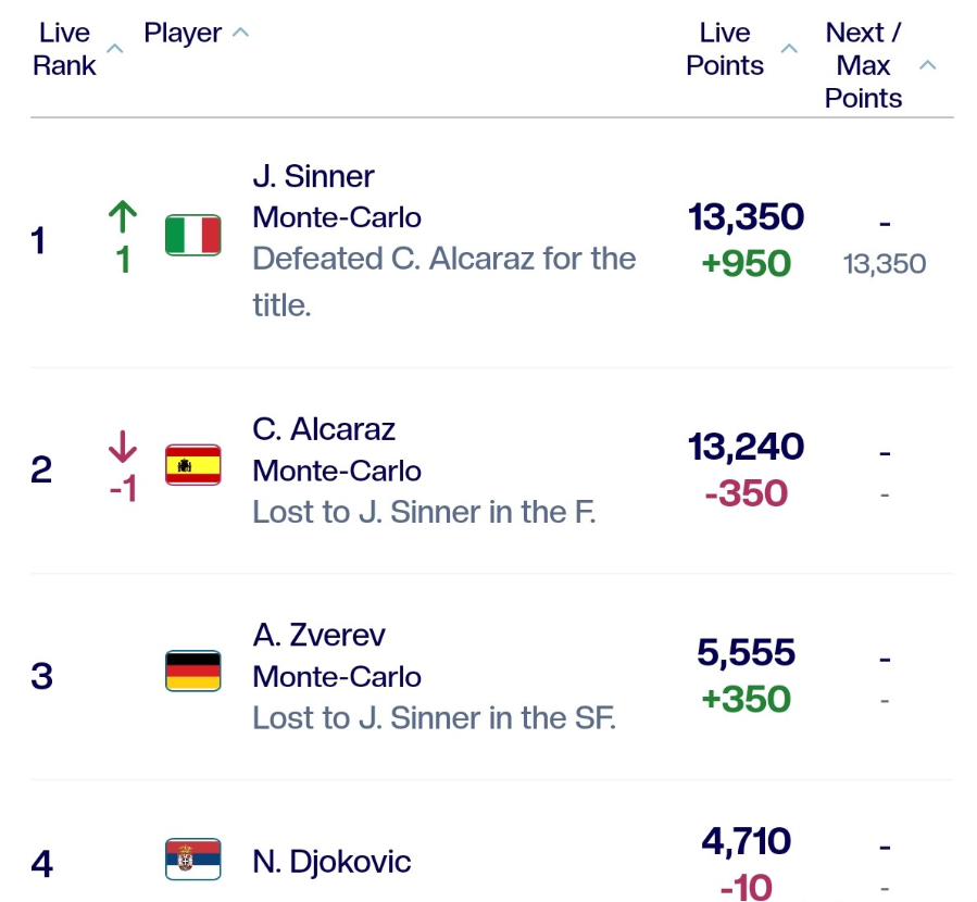 辛纳目前仅以110分的微弱优势领先阿尔卡拉斯。如果阿尔卡拉斯在巴塞罗那表现出色,拿到冠军,世界第一将再次易手。去年阿尔卡拉斯在决赛输给鲁内,有330分要扣除。如果夺冠,有170分的涨分空间。