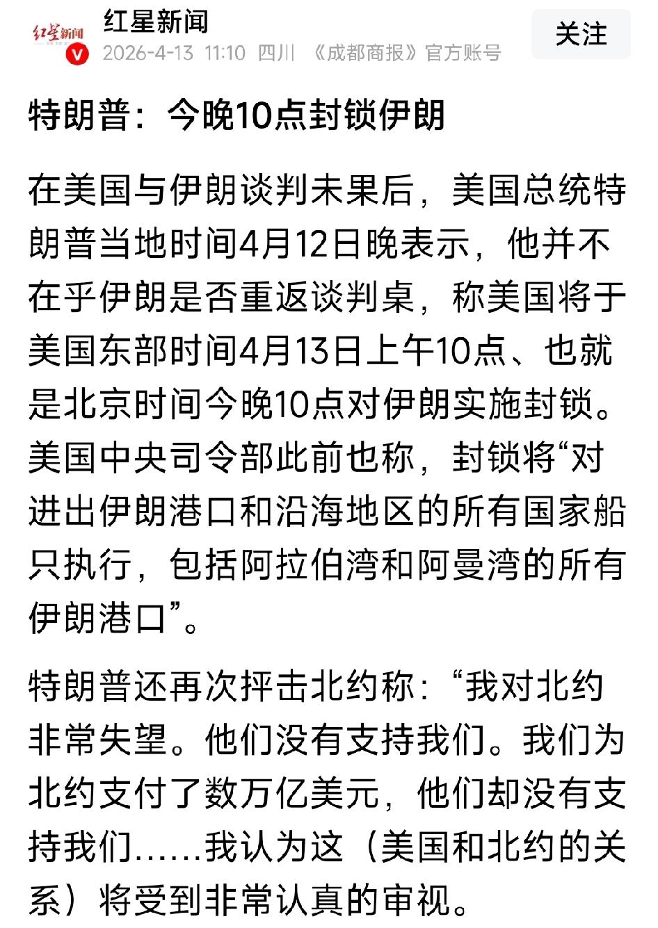 美单边施压升级 中东局势再临危机!美伊伊斯兰堡谈判无果而终,地区紧张局势迅速升级。当地时间4月12日,美国总统特朗普公然宣称不在乎伊朗是否重返谈判桌,并下令于4月13日对伊朗实施全面海上封锁,美国中央司令部同步宣布,将拦截所有进出伊朗港口及沿海地区的他国船只,此举彻底击碎了和平谈判的微弱希望。