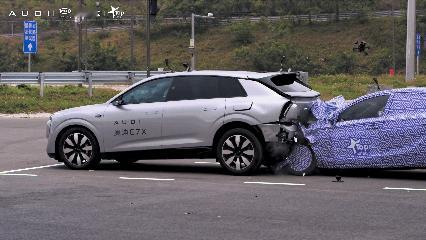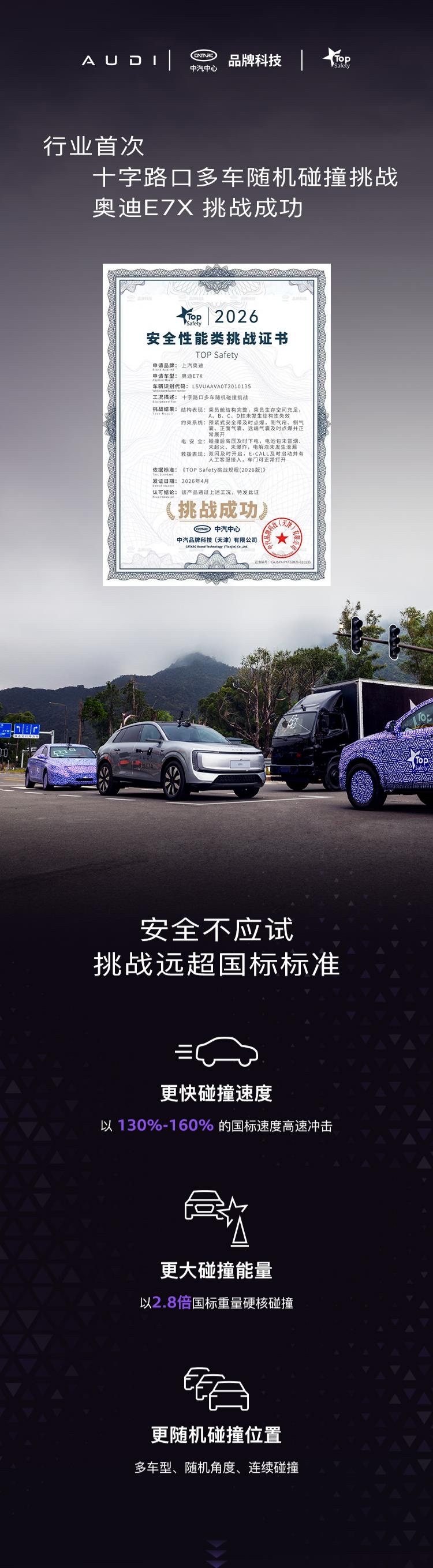 奥迪E7X最近风很大呀, 先是山脊赛道刷圈跑出一个最速SUV,这又来一个“全行业首次十字路口多车随机碰撞测试”。成绩单很漂亮:结构没变形、气囊全弹、电池不炸不冒烟、救援秒接通。奥迪E7X拒绝应试随便撞
