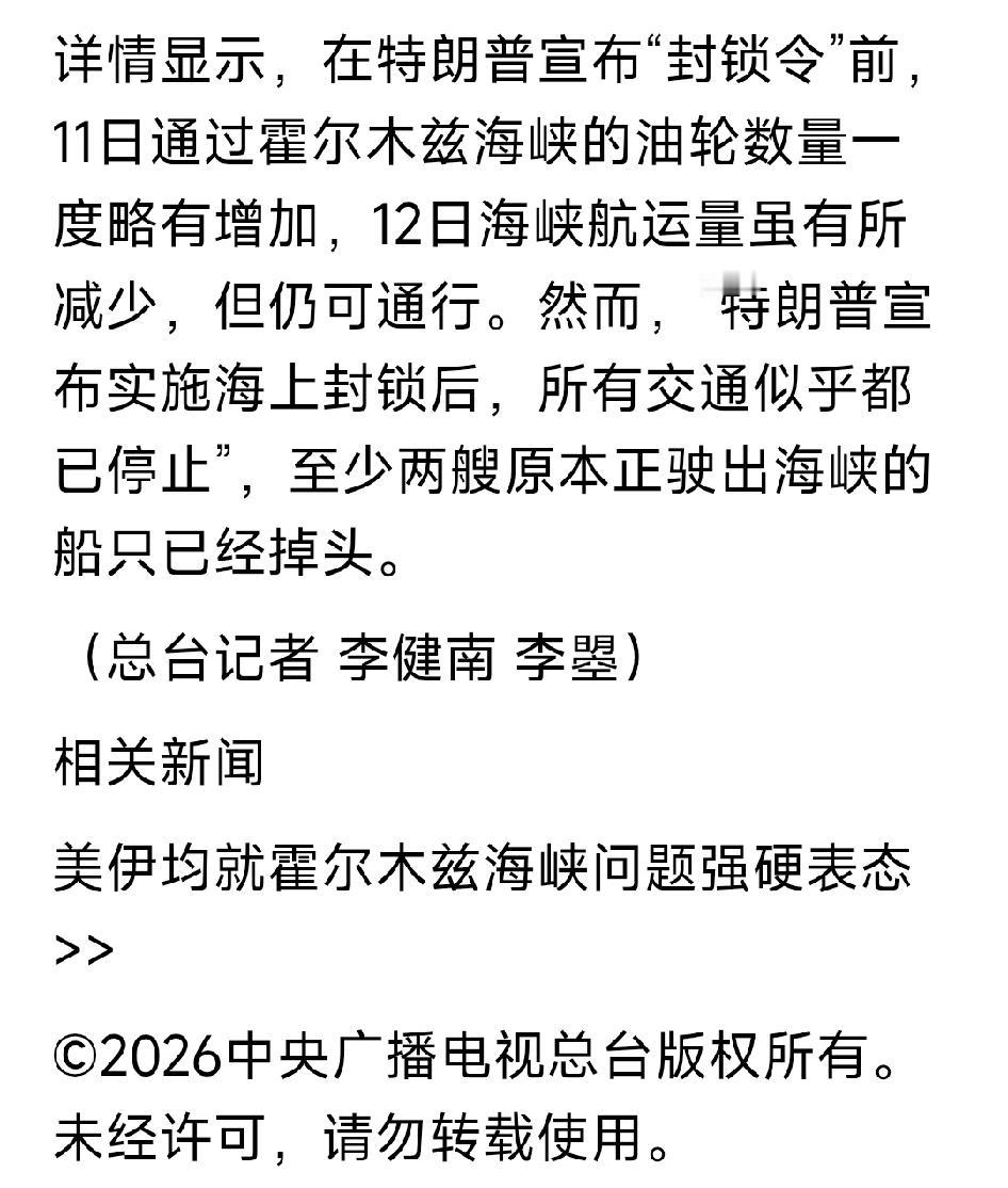 霍尔木兹海峡船舶通行再次完全中断!霍尔木兹海峡航运骤停是单边引发的地缘危机。当地时间13日,在美国总统特朗普宣布对霍尔木兹海峡实施封锁后,这条全球能源咽喉要道的所有通行已彻底停止,原本航行的船只纷纷掉头,海峡航运瞬间陷入停滞。这一突变,让本就紧张的中东局势,彻底滑向更危险的边缘。