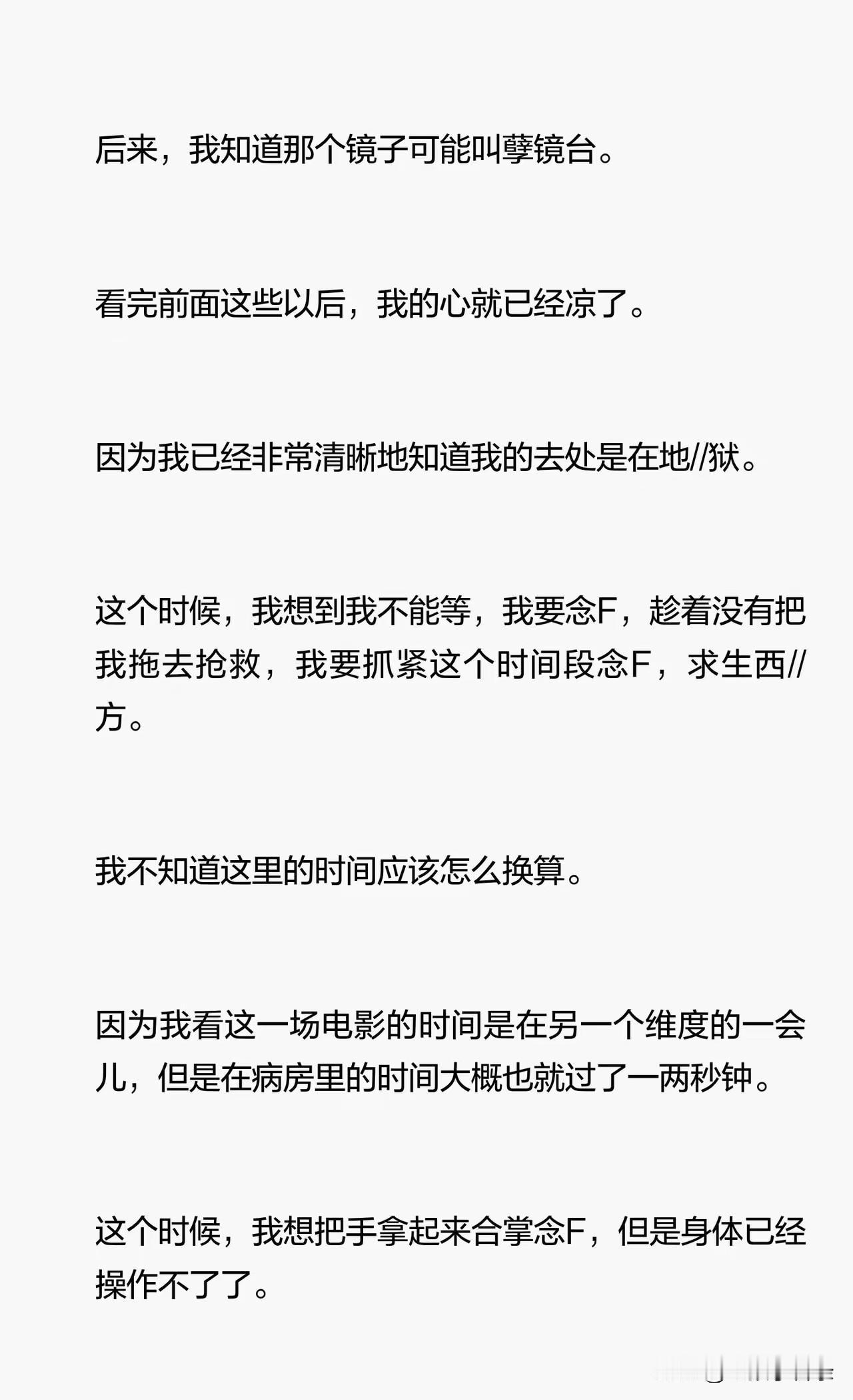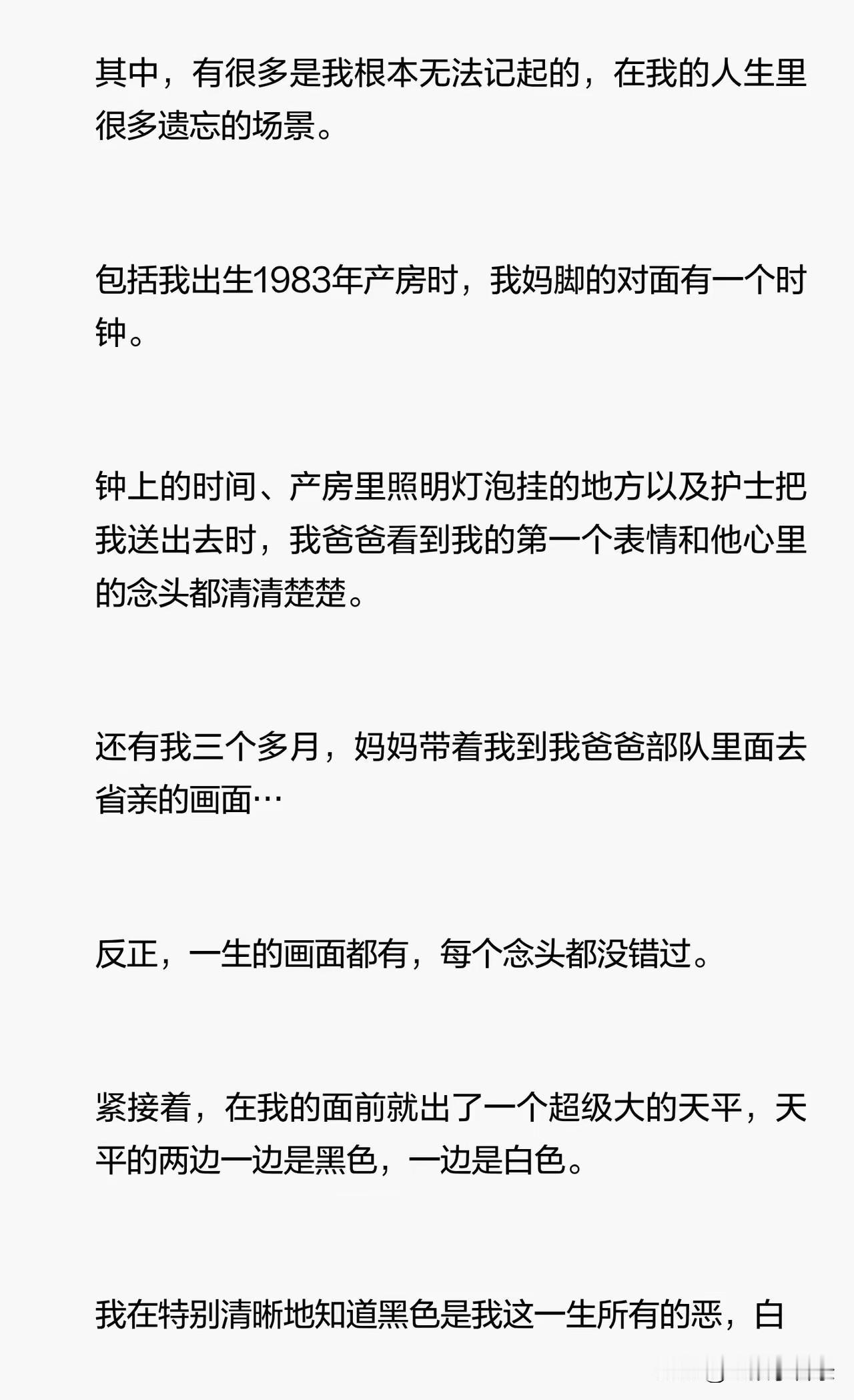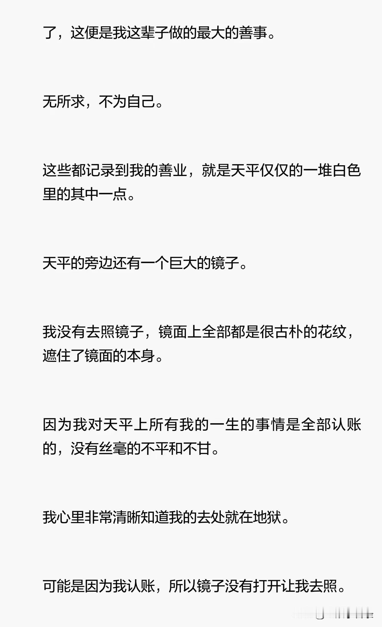 在她抢救的时候,她看到一个偌大的天平,给她了震撼和启示,这个天平一边是黑色一边是白色,黑色的这一边是人的一生所做的恶,白色的这一边是善,一个人一生所做的善恶都有记录,每做一件善恶都在天平上记录,而在人的一生结束的时候,根据天平上善恶的多少,决定这个人是上天堂还是下地狱。