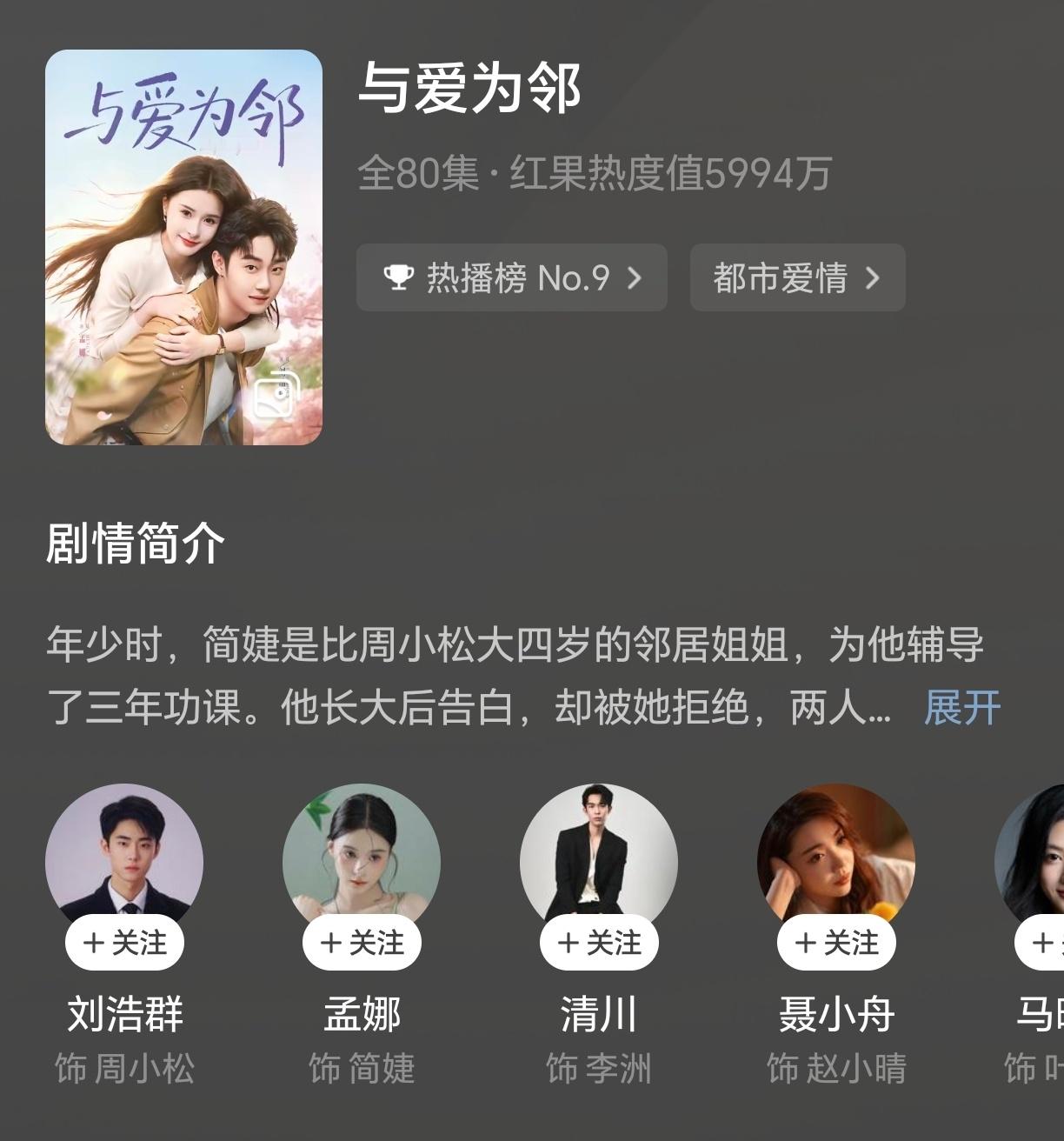 《与爱为邻》这个剧男主爱女主刻画得很细致,但是女主为什么爱男主我想不通,甚至是有一个绝好的前夫,缺少更具体的事情。刘浩群看着不帅,但很适合女频,孟娜姐感很绝啊。